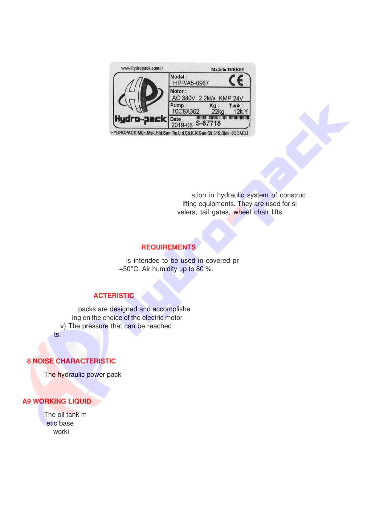 The hydraulic power pack does not emit noise higher than 85 dB in accordance to EN 60034–9.