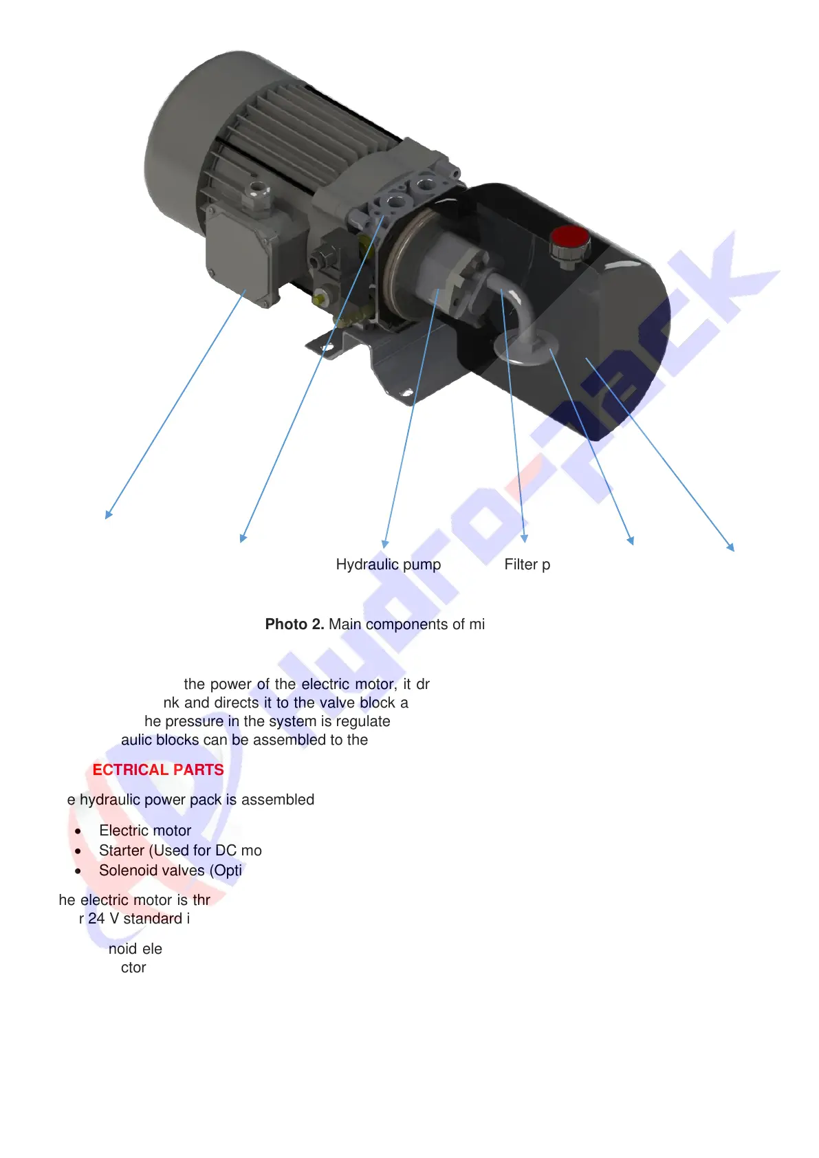 At switching on the power of the electric motor, it drives the gear pump. The pump sucks the working