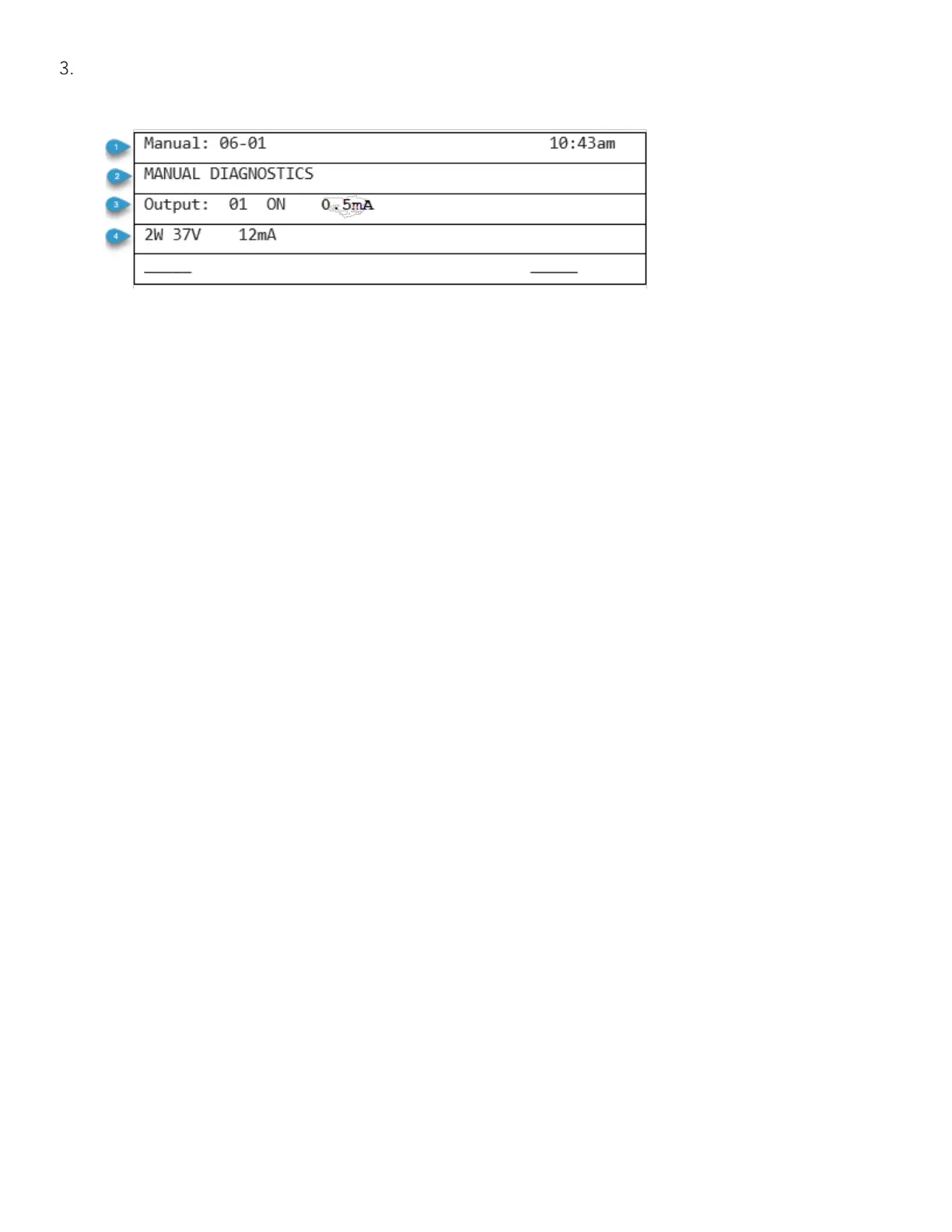 Line 3: Decoder output number, On/Off, mA value per decoder.