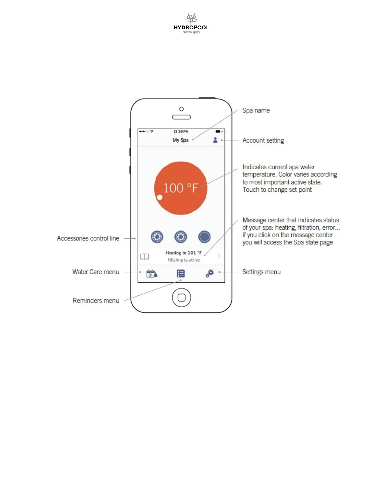 The main screen gives you access to your accessories, water temperature, water care and