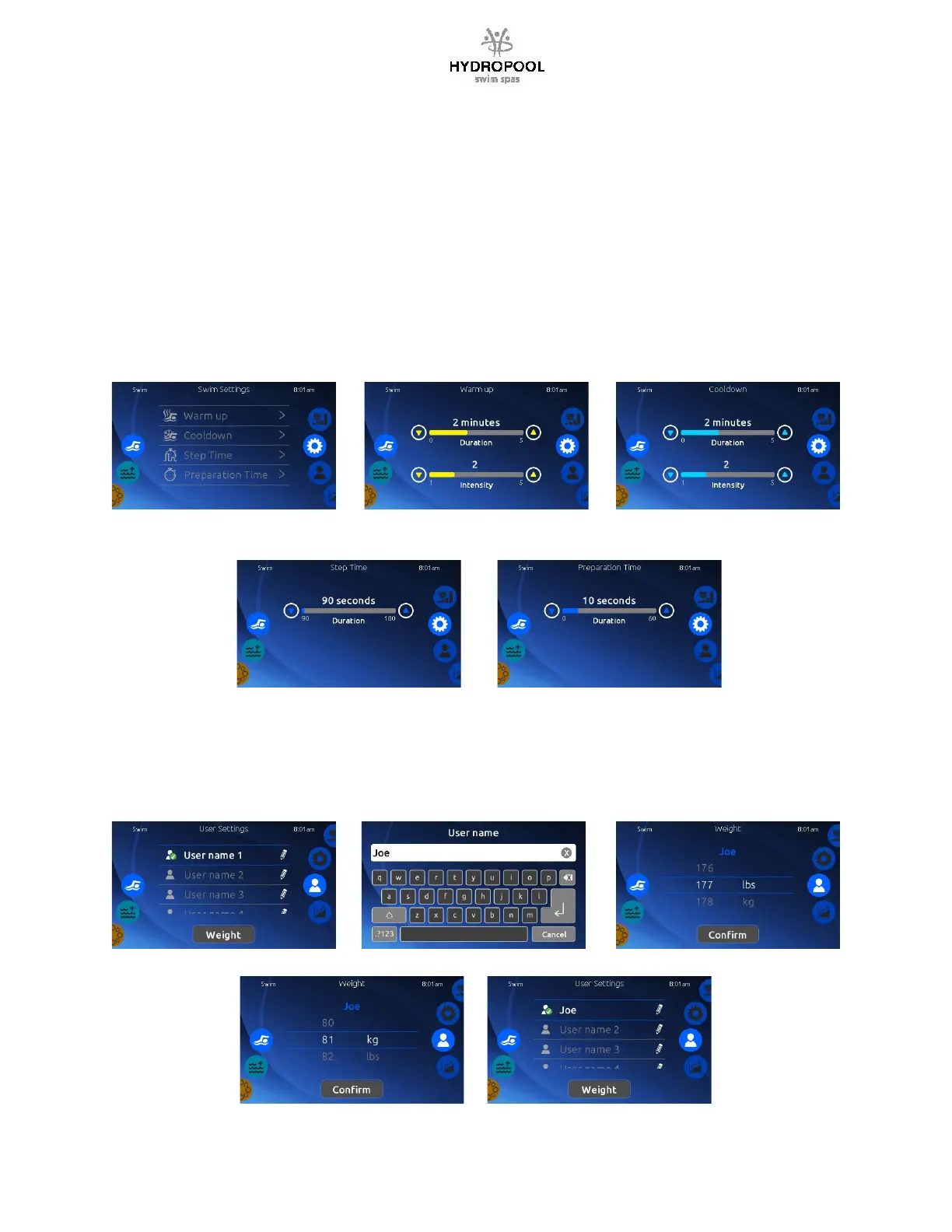 Hydropool 13FFP Aquaplay - Aquapro EX Swim and User Settings; Swim Settings Selection; User Settings Selection