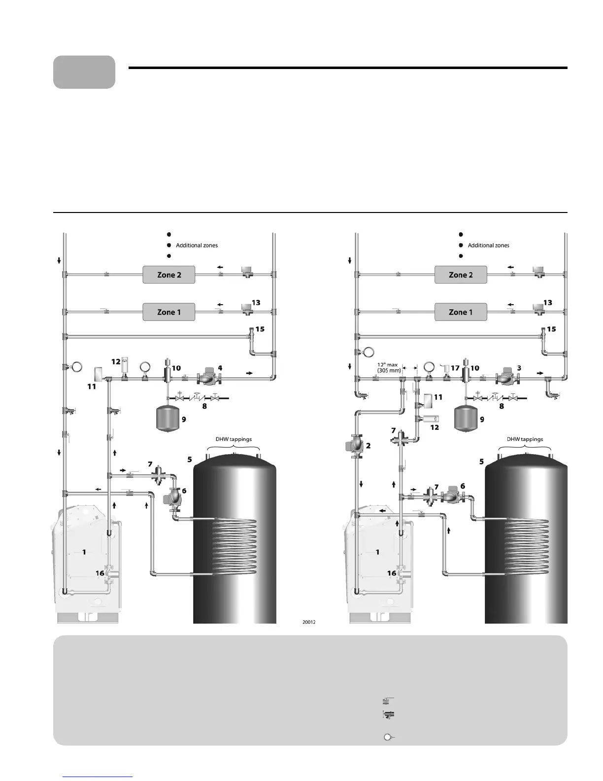 Figure 8 Suggested piping — single boiler — zone valve zoning — two-pipe or series loop (left), or primary/secondary piping (right)