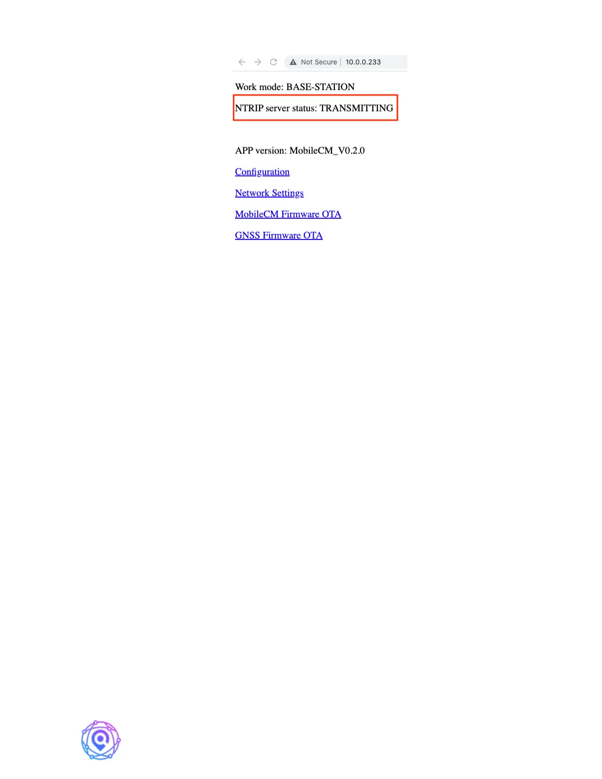 Check the NTRIP server status. If it says “TRANSMITTING”, record this IP (e.g.,