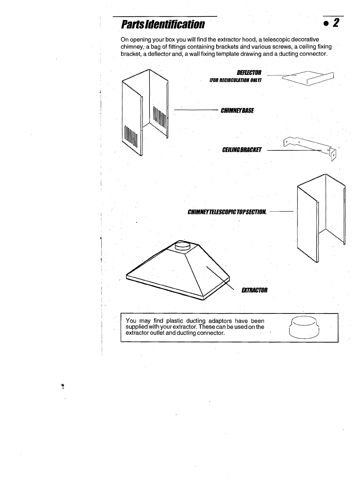 chimney,' a bag of fittings containing brackets and various screws, a ceiling fixing