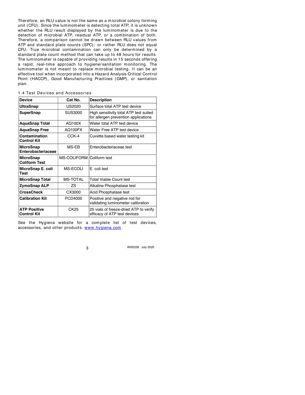See the Hygiena websit e for a com plet e list of t est dev ices,