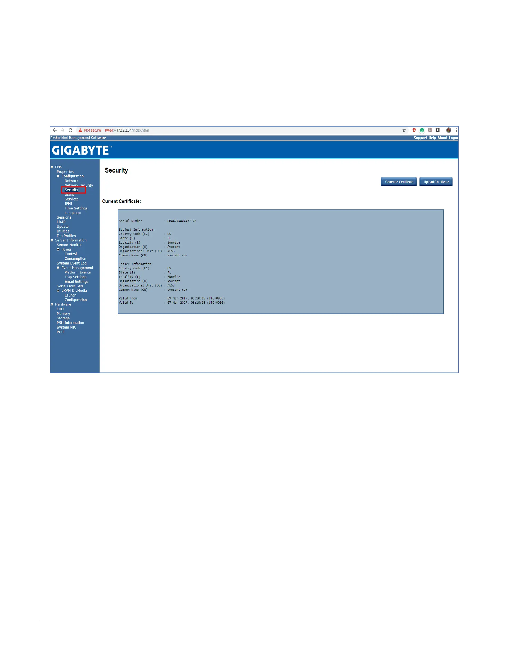 The Security page shows the current certificate status.