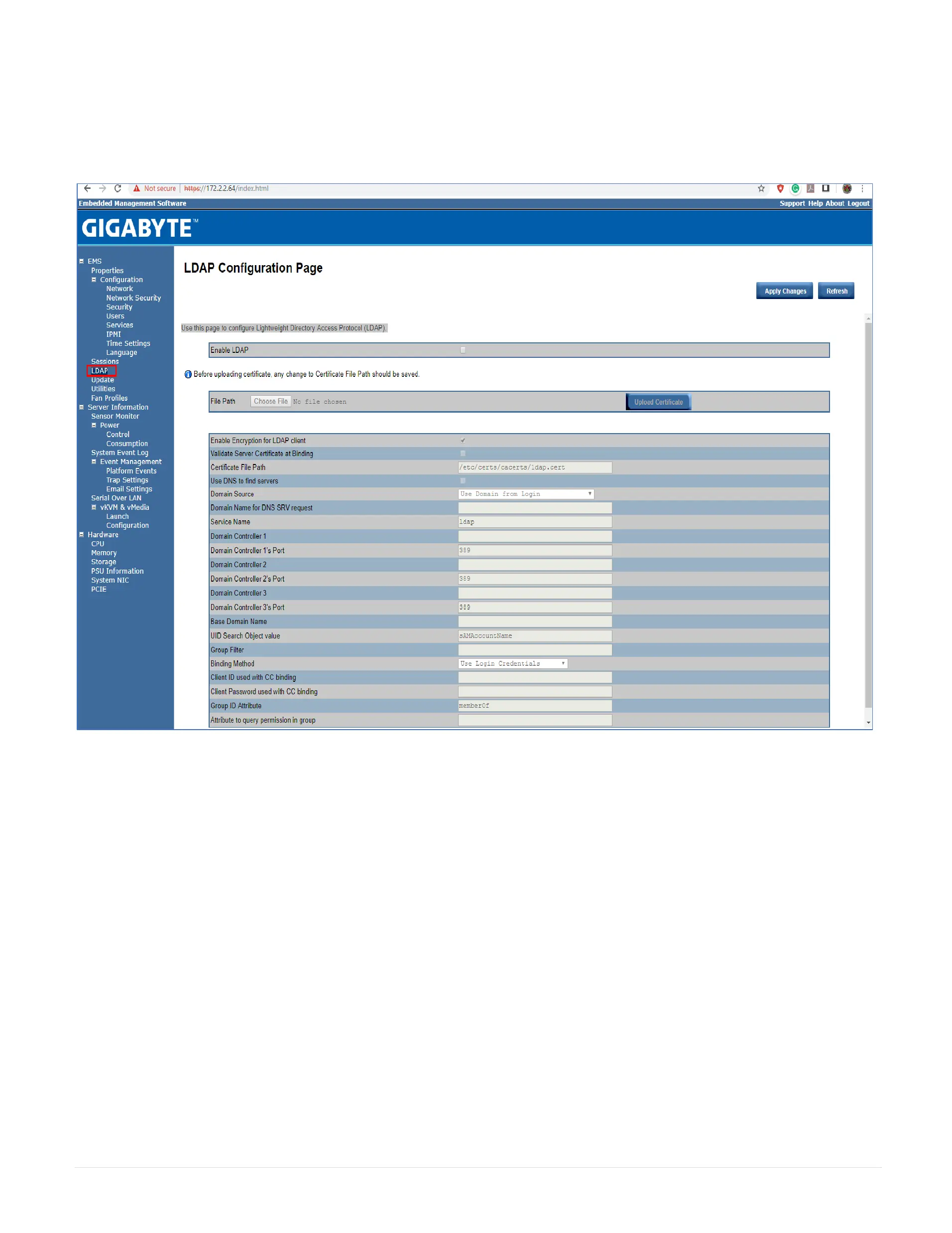 Check the box below to enable LDAP authentication and enter the required information to access the LDAP server. Click Apply Changes to save your changes.