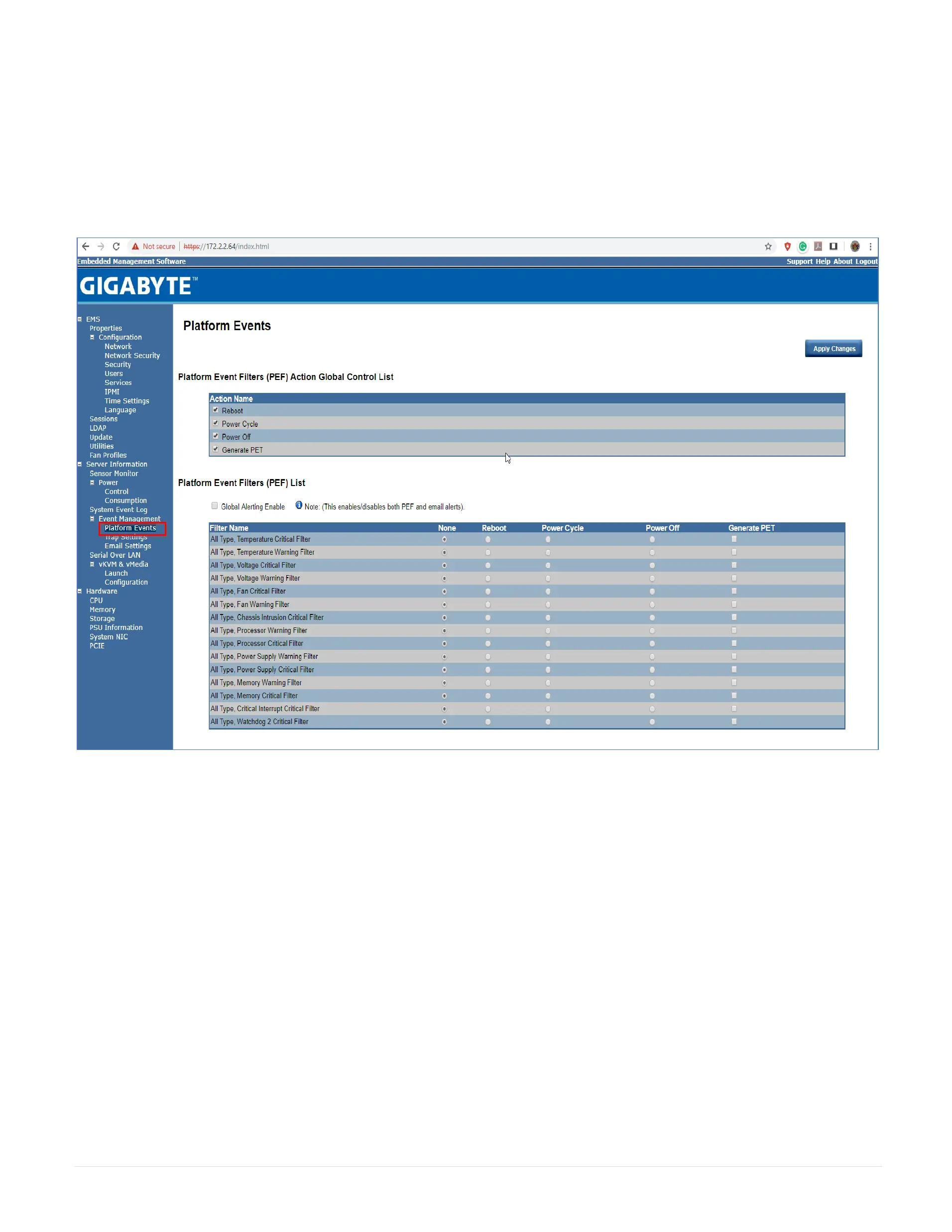 A platform event filter (PEF) can trigger an action and generate an alert when a critical hardware-related event occurs. For each PEF, you can choose the action to be