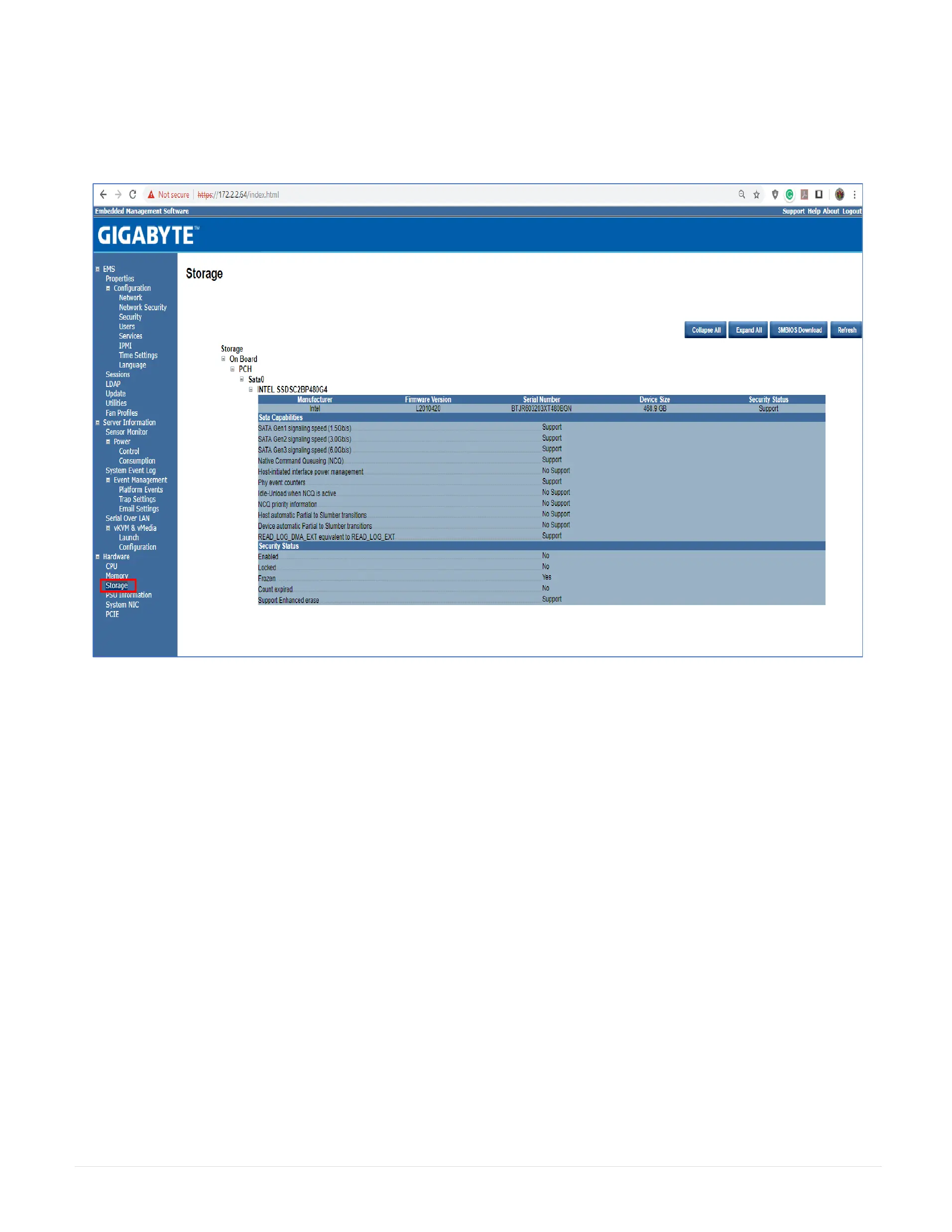 This page displays the connected hard disk drive and hardware health information.