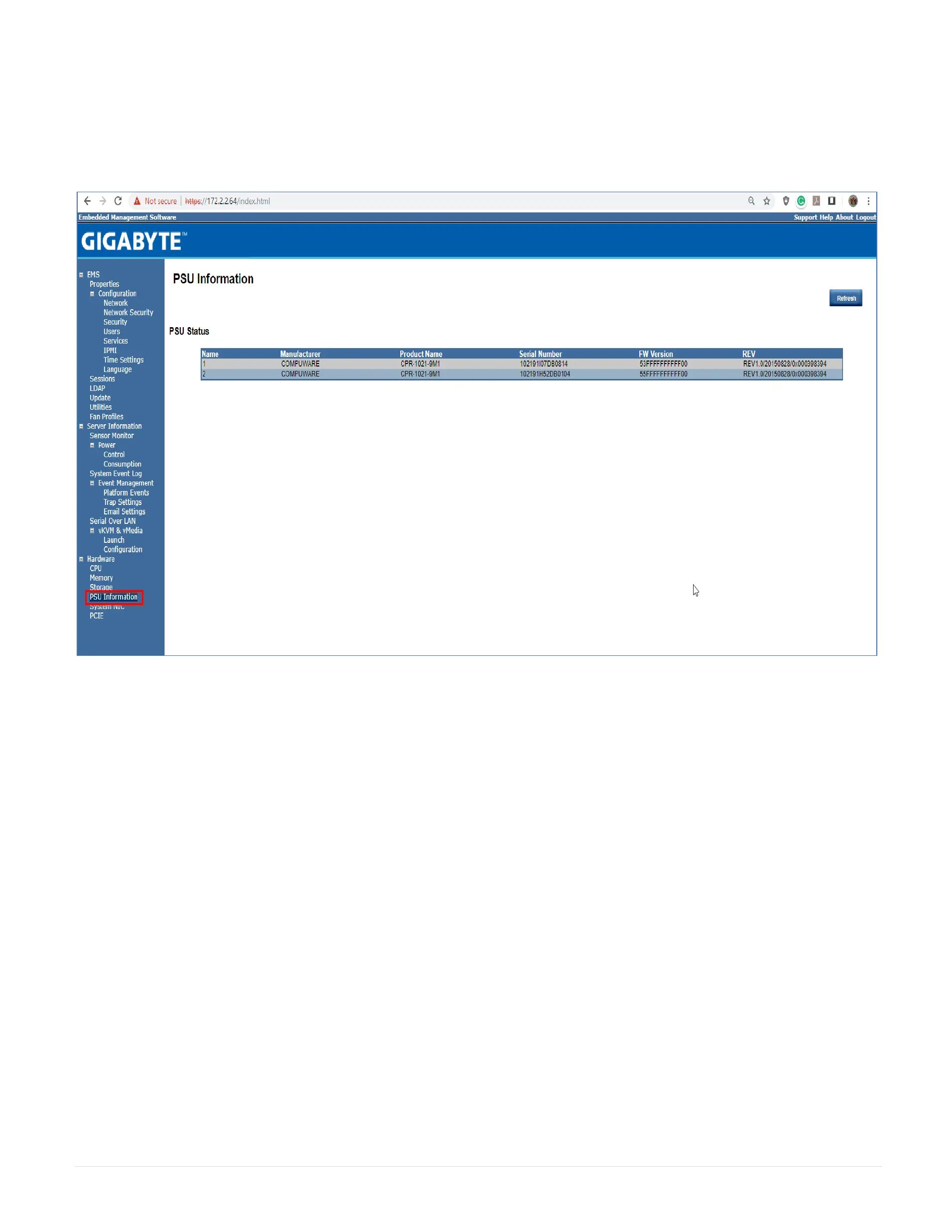 This PSU page displays the connected Power Supply unit’s information like Manufacturer, Serial number, Firmware version etc.