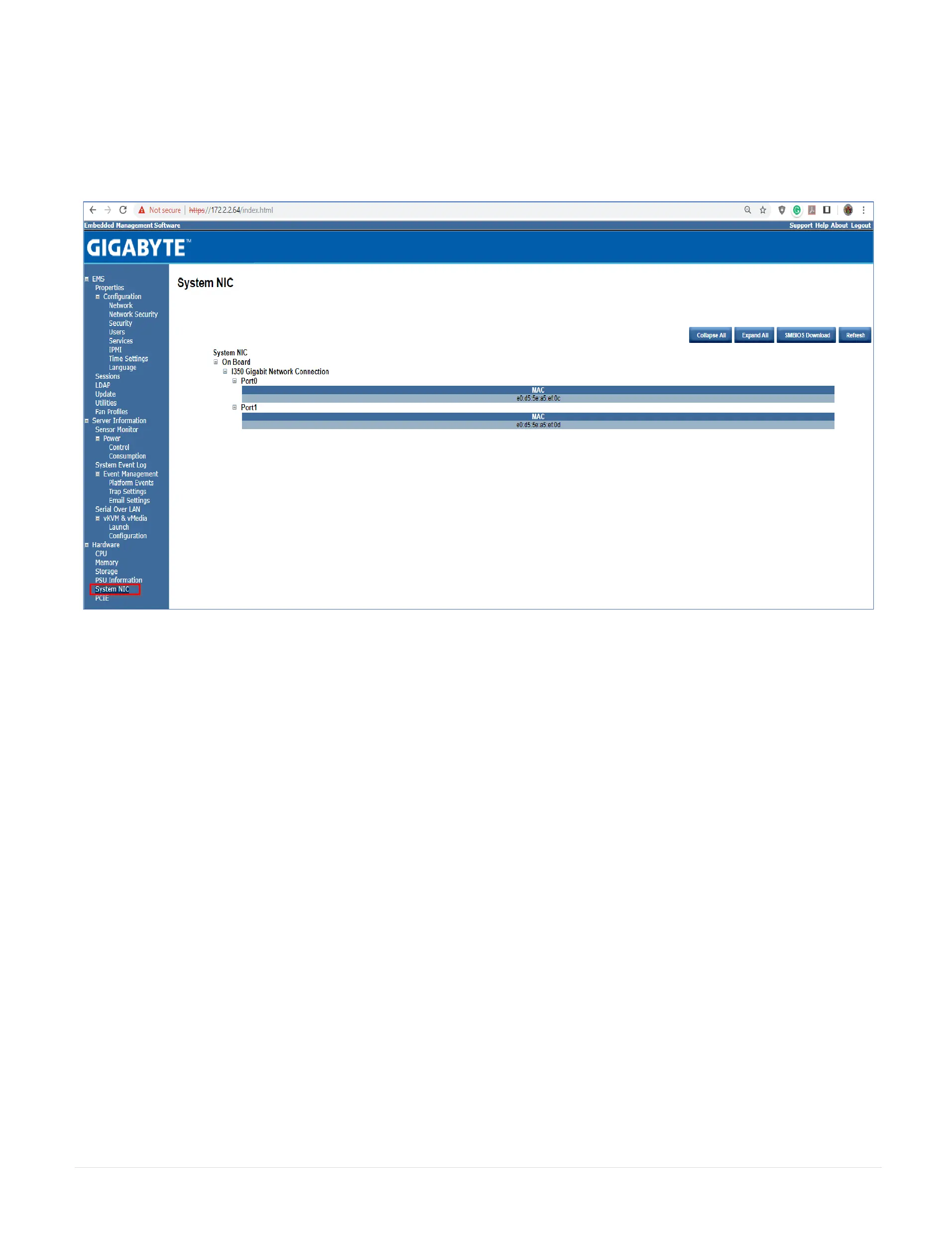 This System NIC page displays the connected network cards information.