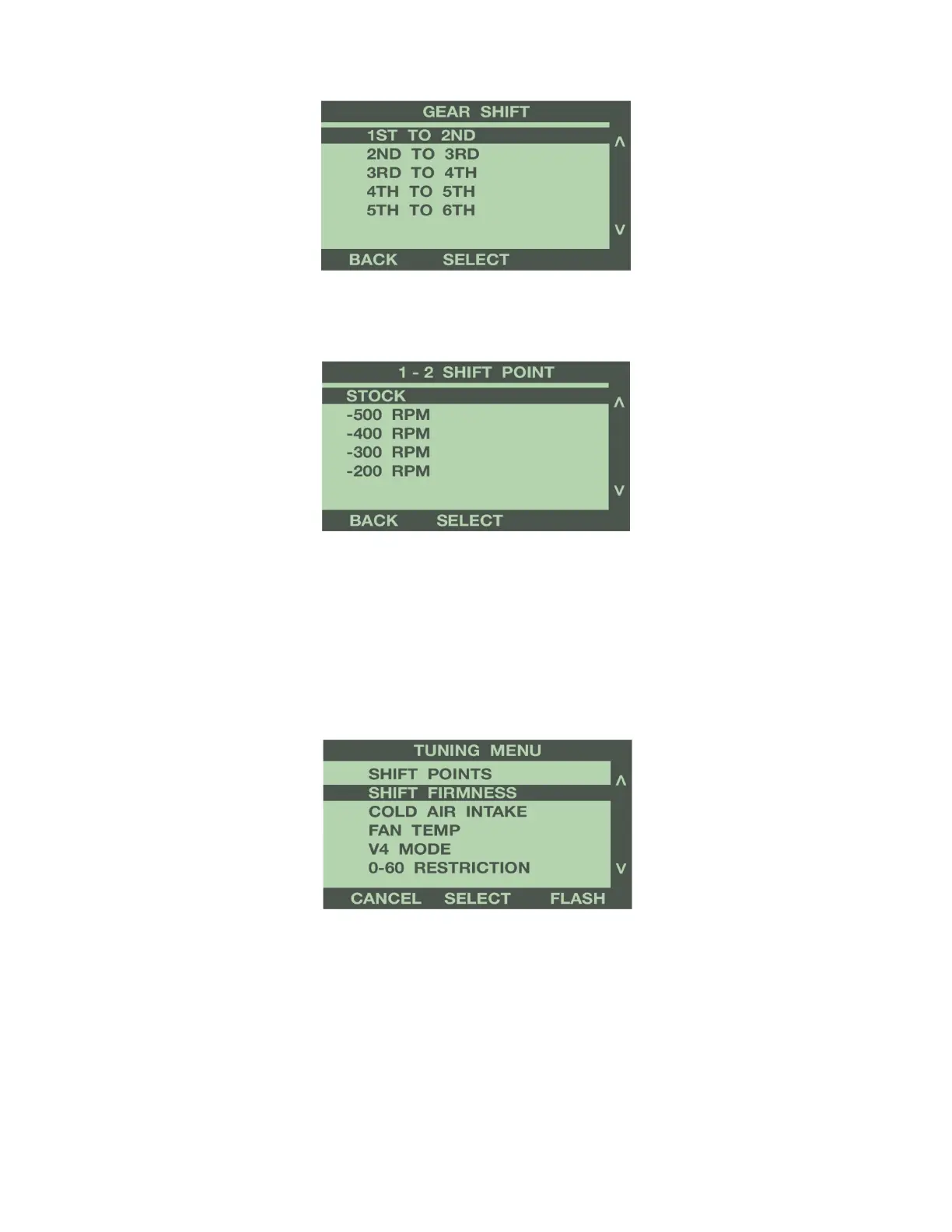 highlight the value to increase or decrease the shift points, in 100 RPM increments. Press Select