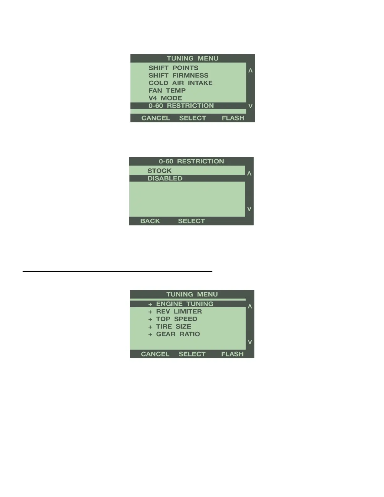 The next screen displays all of the Tuning Options for your vehicle, and the options selected. Use the buttons to