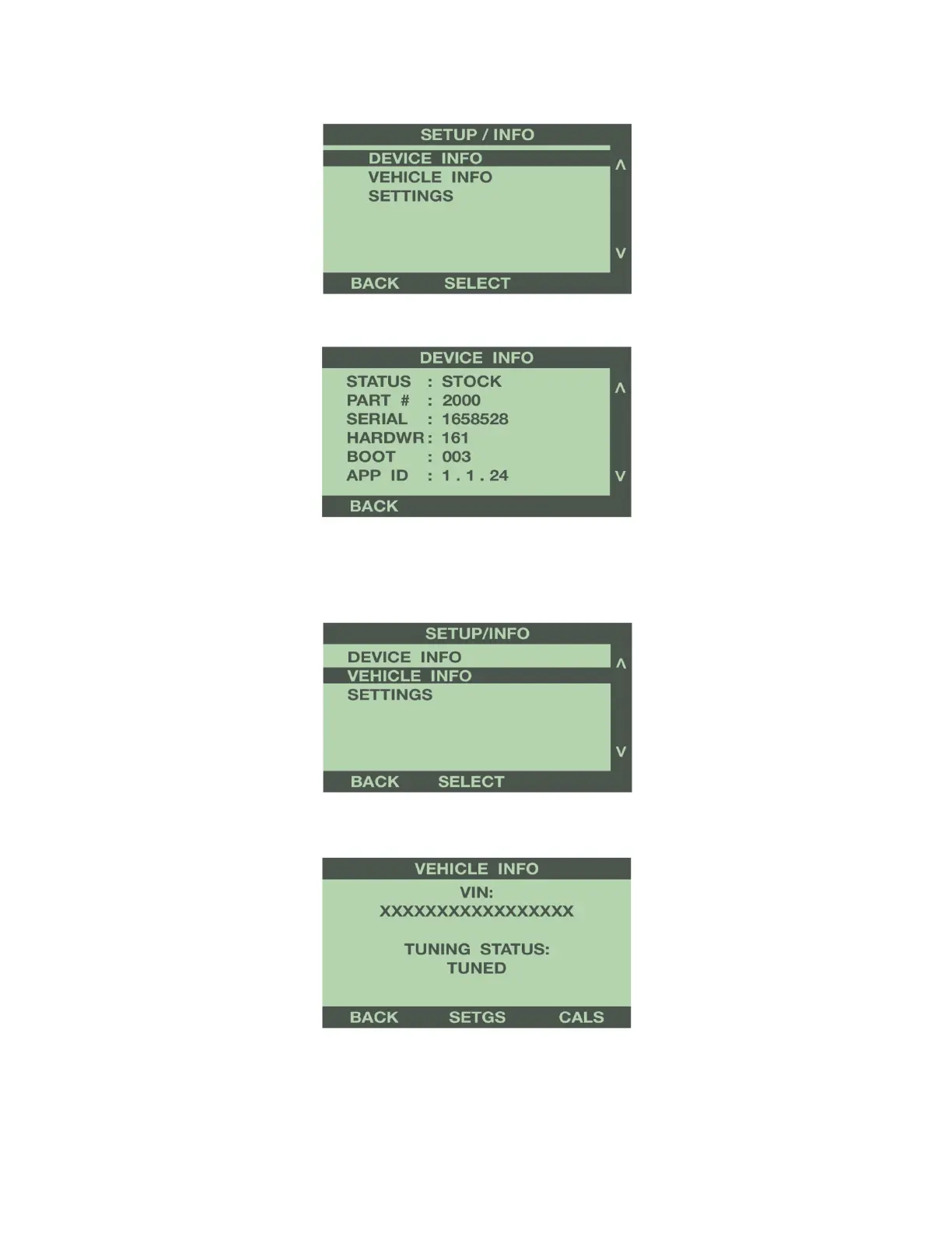 Select ‘Setgs’ to view the current options that are programmed in the vehicle. Select ‘Back’ button to return to