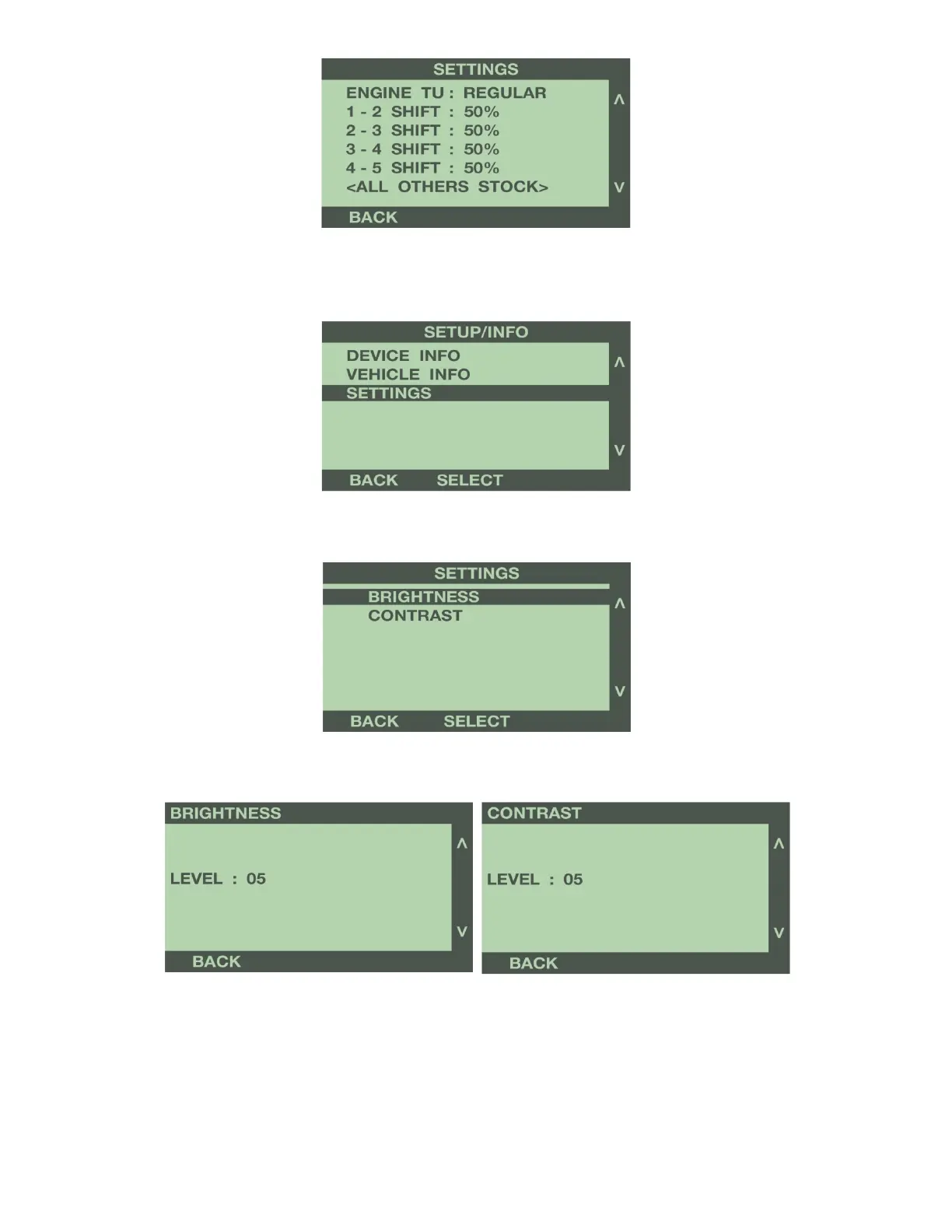 Use the buttons to the right of the screen to adjust the brightness or contrast of the display screen, from 1 to 10.
