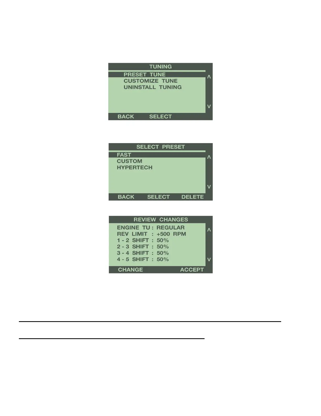 To flash a previously saved tune, use the buttons to the right of the screen to highlight Preset Tune. Press the
