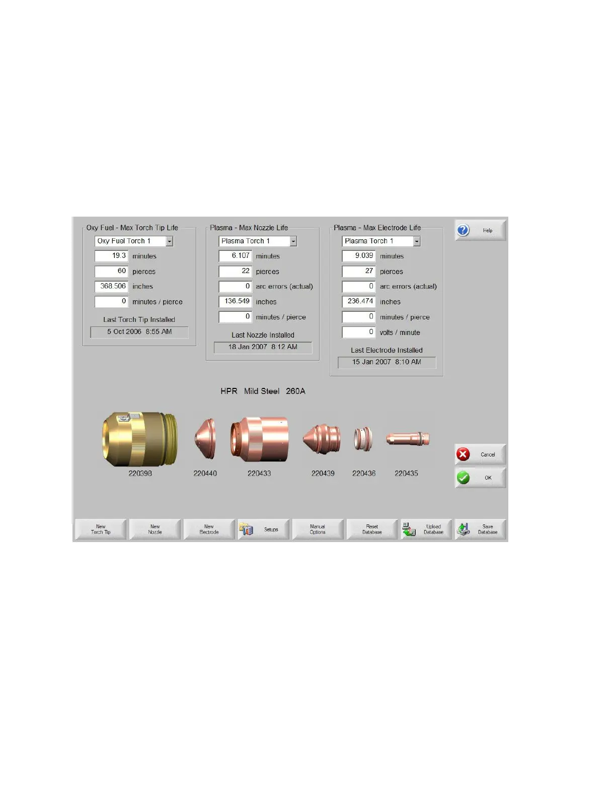 show the date a consumable was changed and how long it lasted in minutes, pierces, inches / mm of