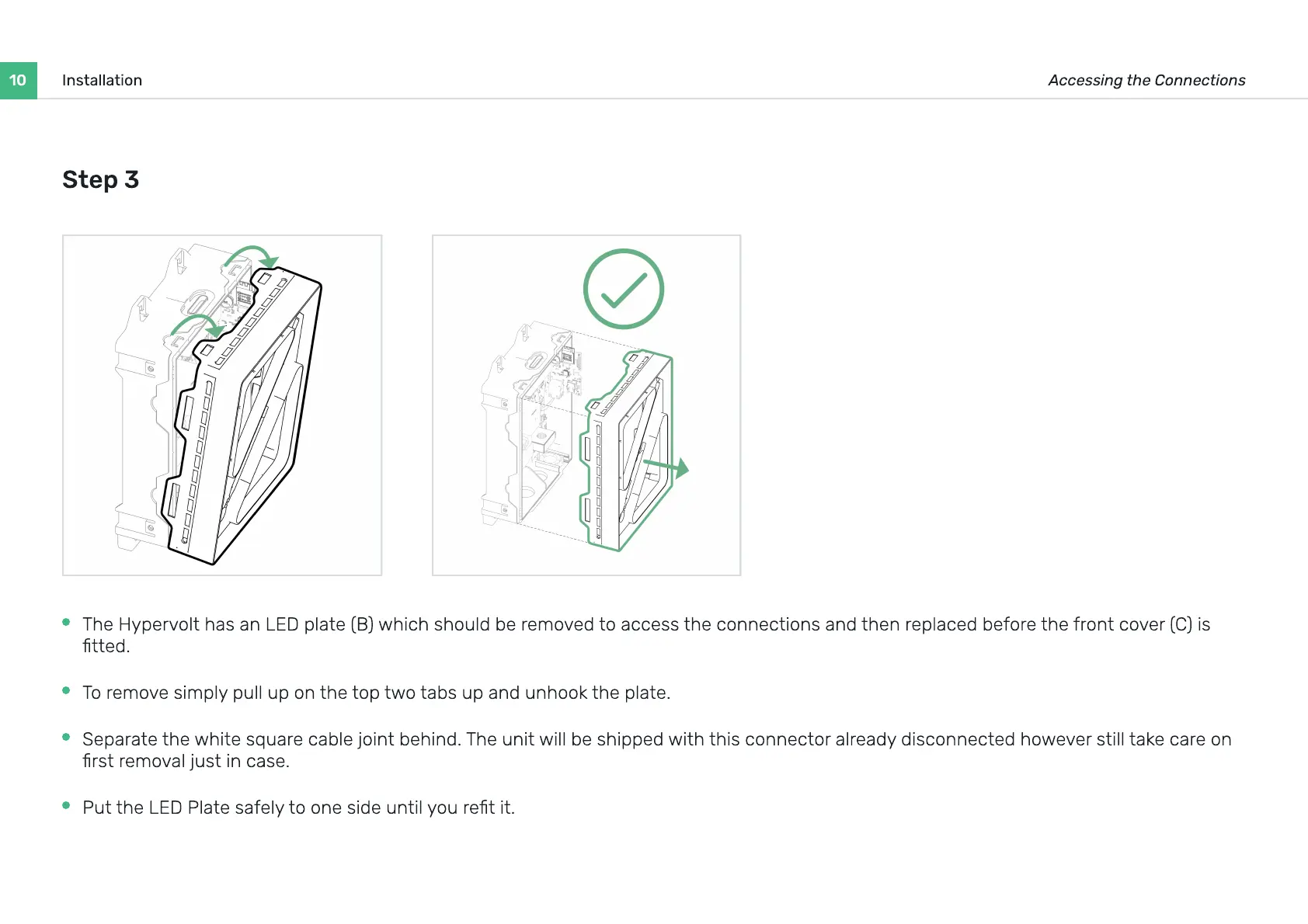 The Hypervolt has an LED plate (B) which should be removed to access the connections and then replaced before the front cover (C) is