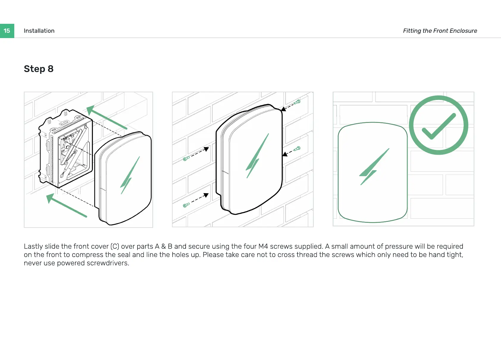 Lastly slide the front cover (C) over parts A & B and secure using the four M4 screws supplied. A small amount of pressure will be required