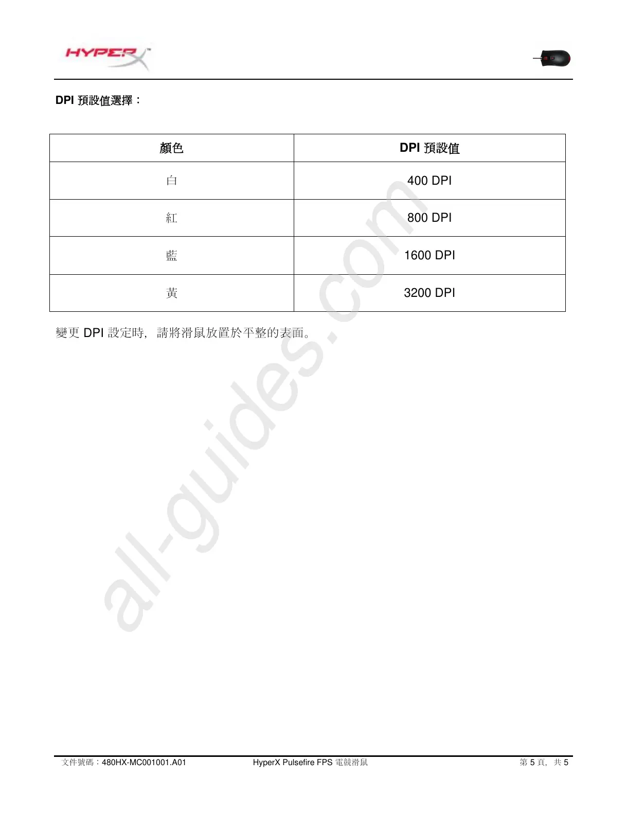 變更 DPI 設定時,請將滑鼠放置於平整的表面。