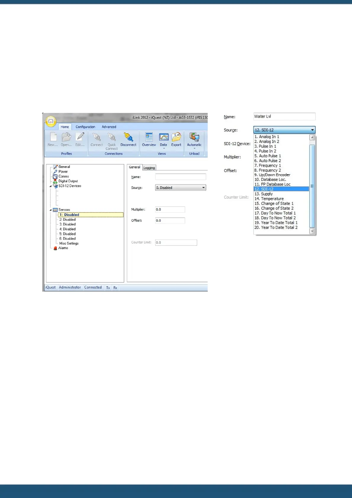 This example shows how to set up a simple iRIS sensor configuration to measure water level from an SDI-12 sensor and