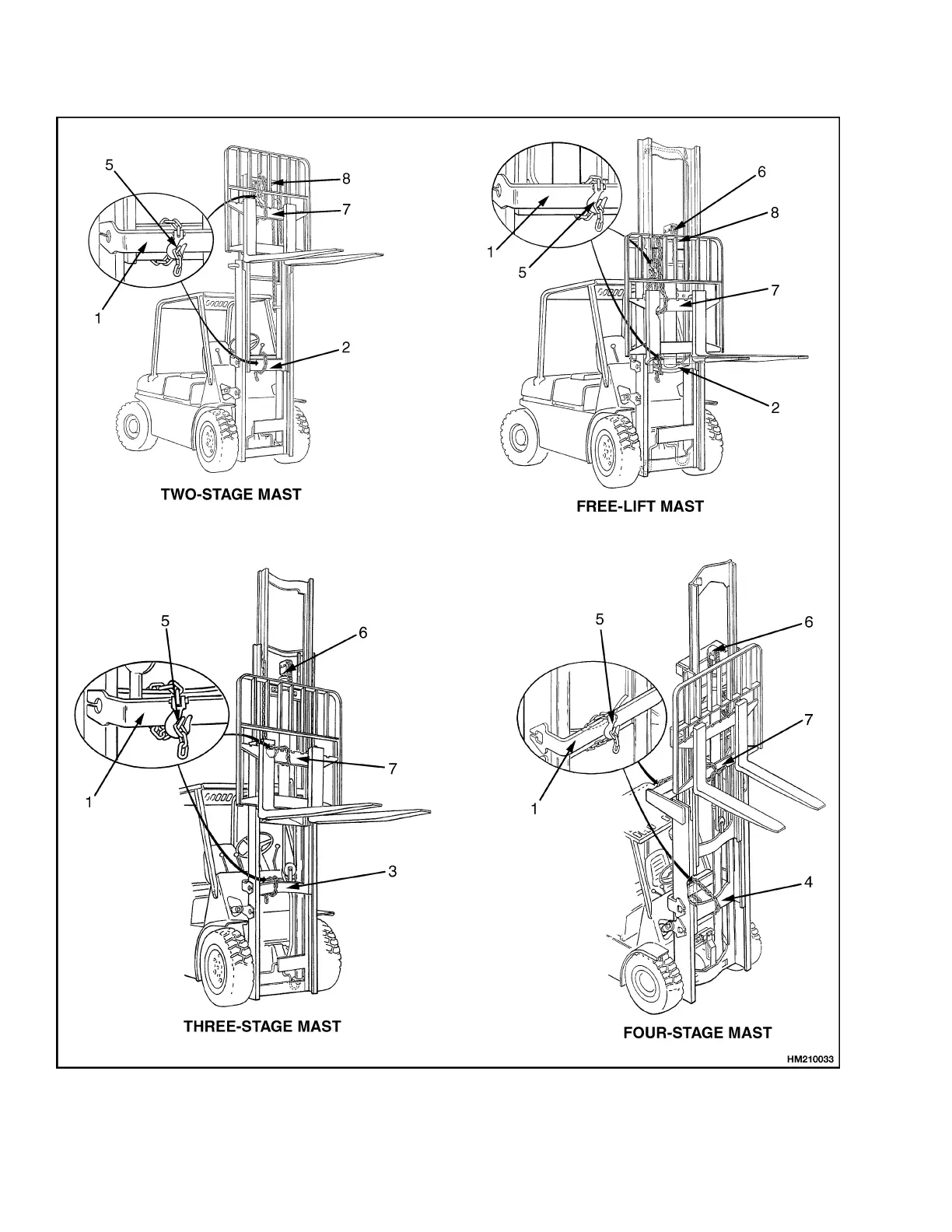 Figure 40. Two-Stage, Free-Lift, Three-Stage, and Four-Stage Masts