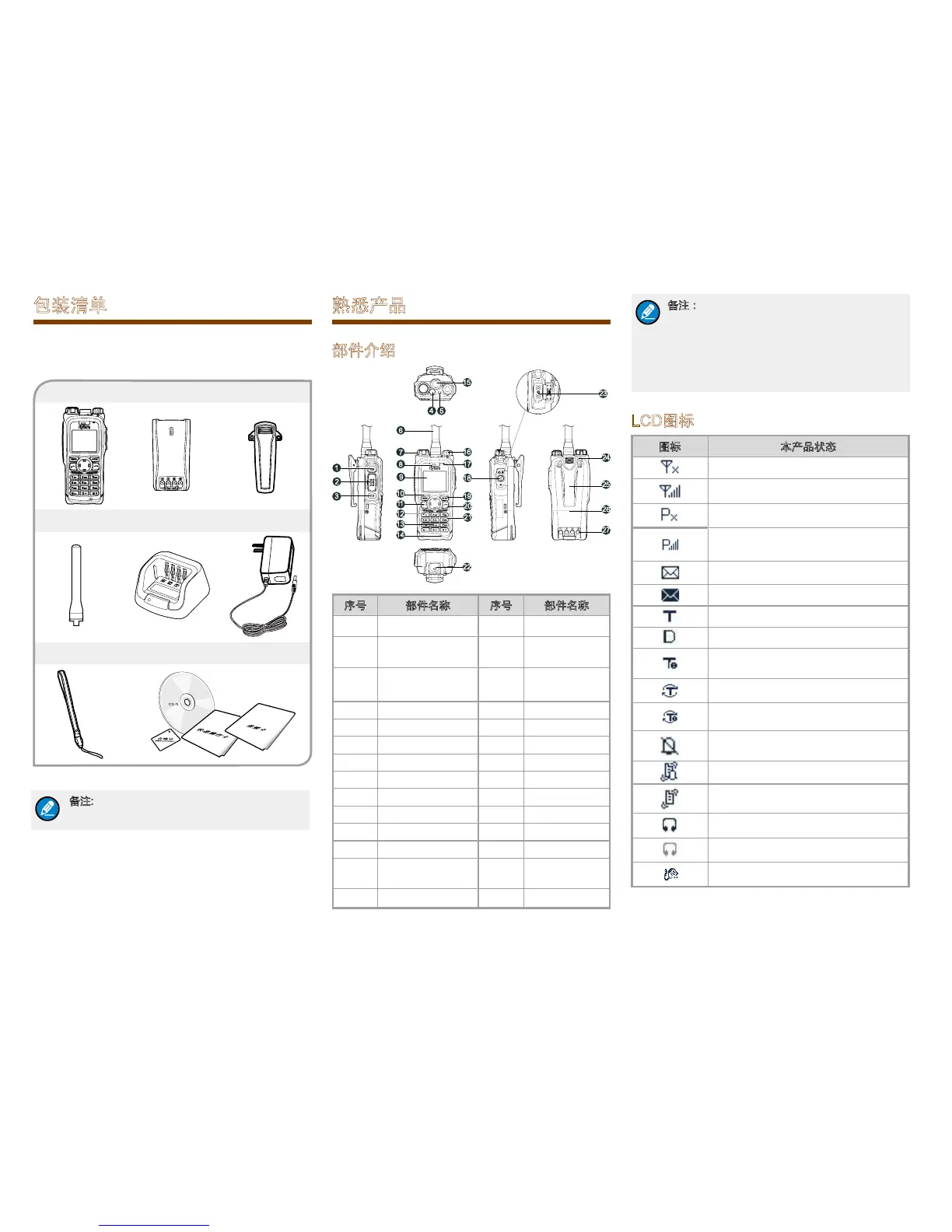 Hytera PT580H Plus - 包装清单; 熟悉产品; 部件介绍; Lcd图标