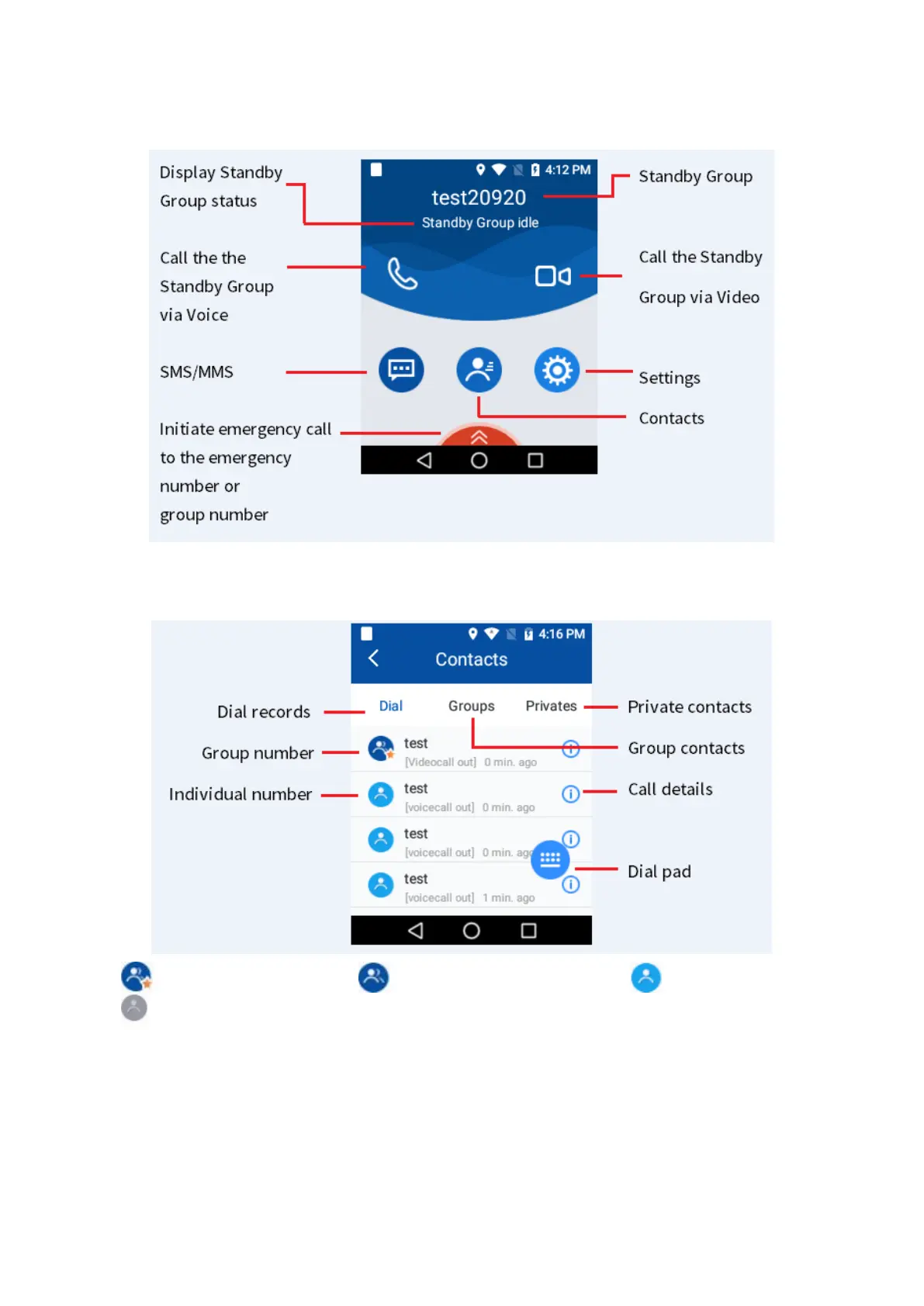 group call details (including group number, group type, call /video call/SMS/MMS shortcut, call level