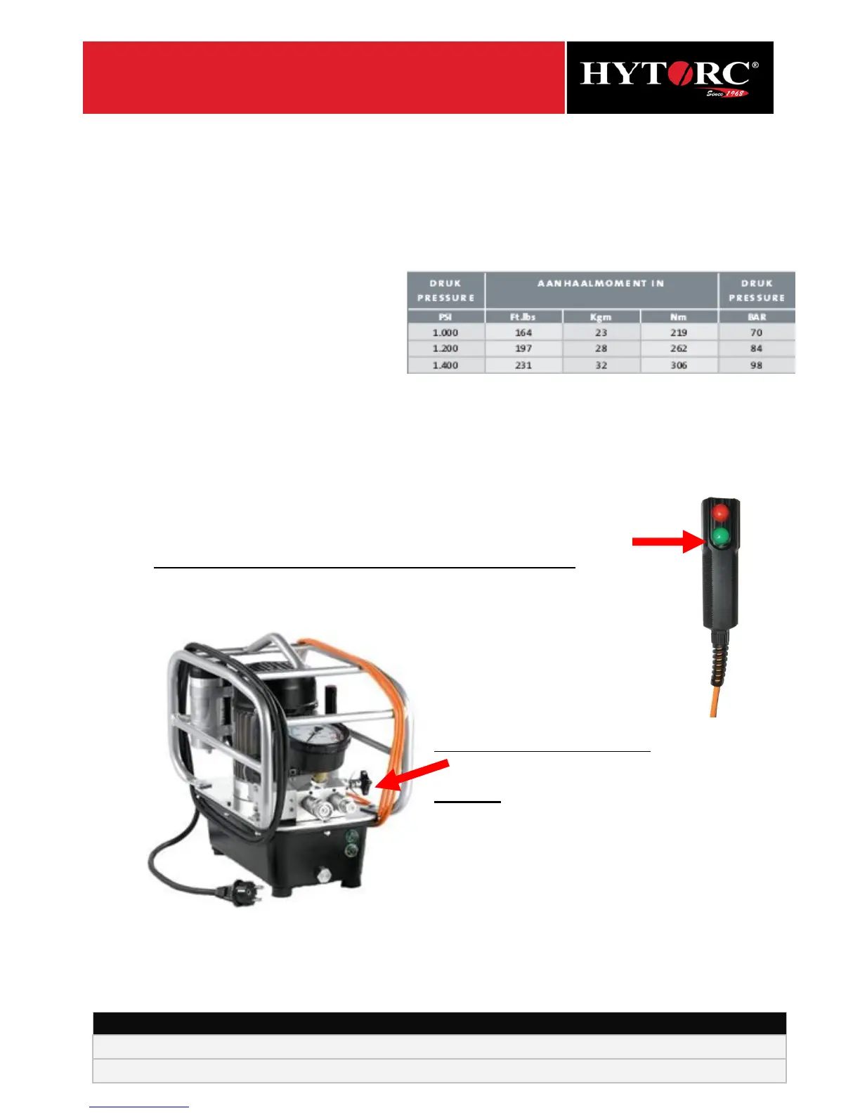 The HYTORC hydraulic pump unit has a working range of 20 BAR until maximum 700 BAR.