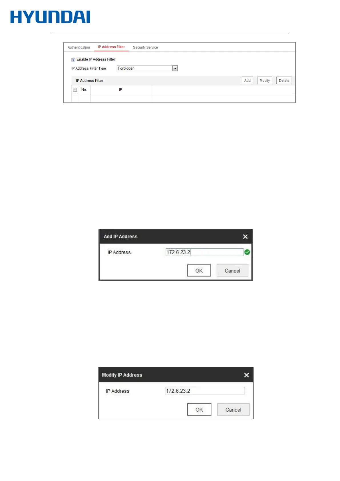Select the type of IP Address Filter in the drop-down list, Forbidden and Allowed