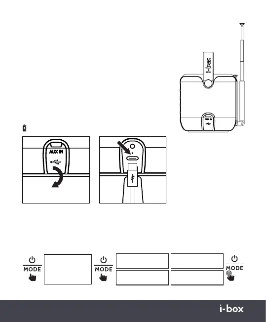 le modalità, DAB, FM, BT e AUX. Per spegnere, tenere premuto il pulsante