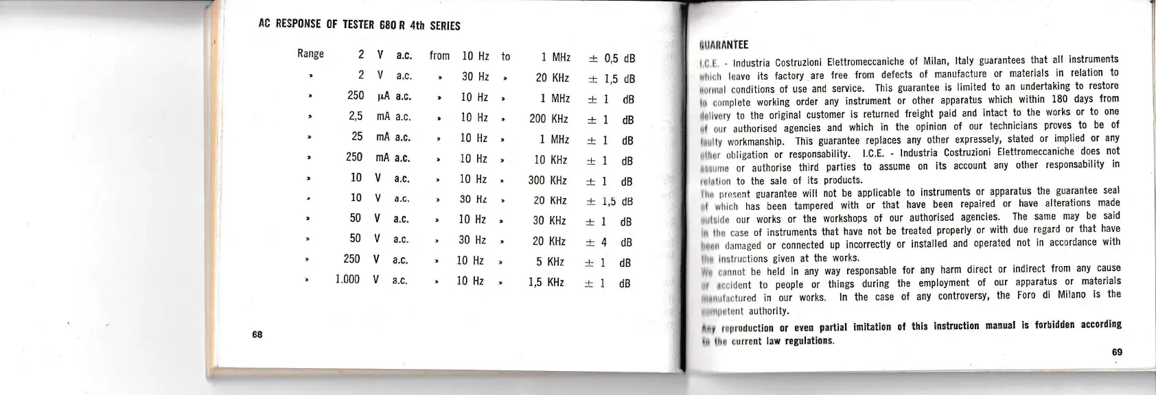 I.C.E Supertester 680 R - AC RESPONSE OF TESTER 680 R 4 th SERIES; Guarantee and Warranty Information