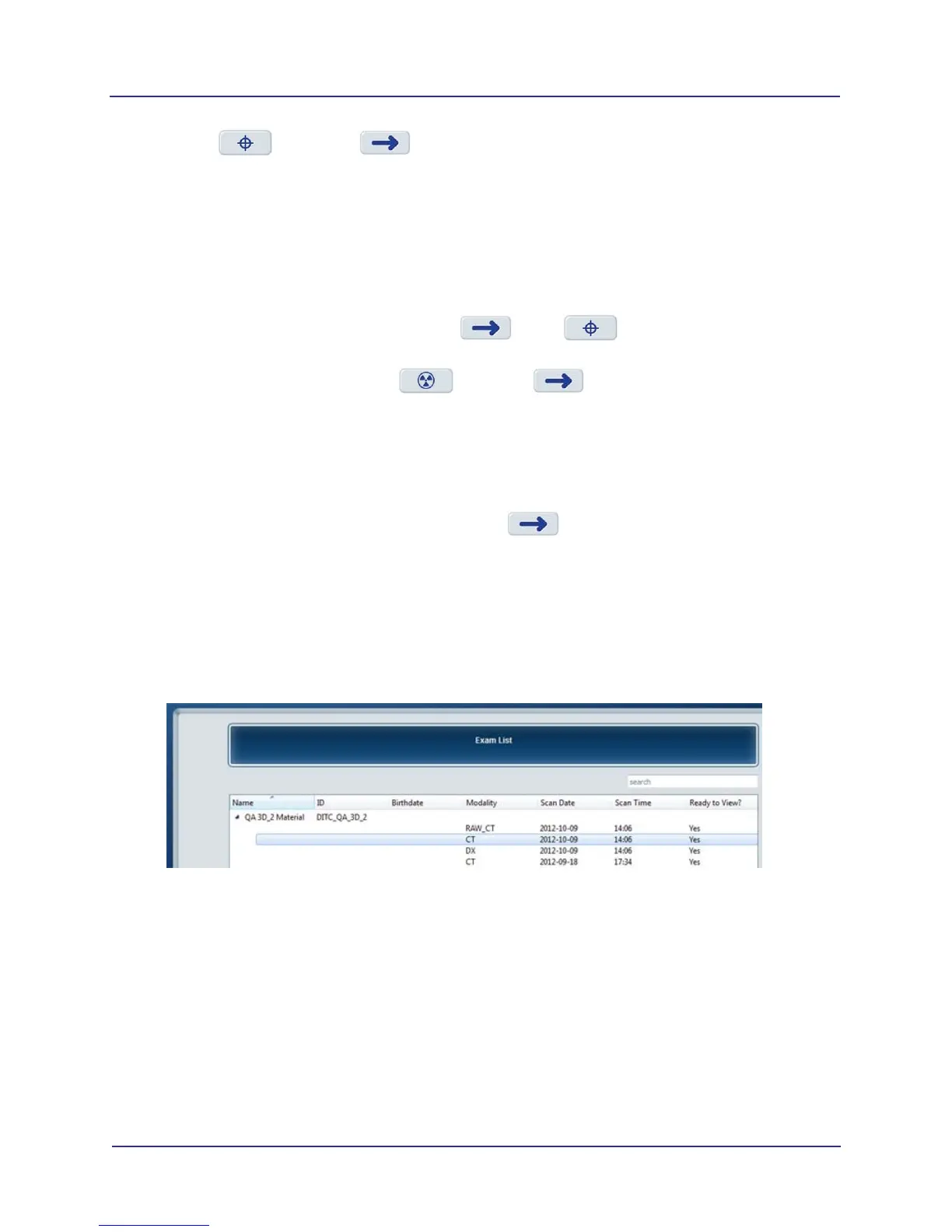 2. On Exam List, locate QA 3D_2 Material exam with most current date. Double-click CT entry to load