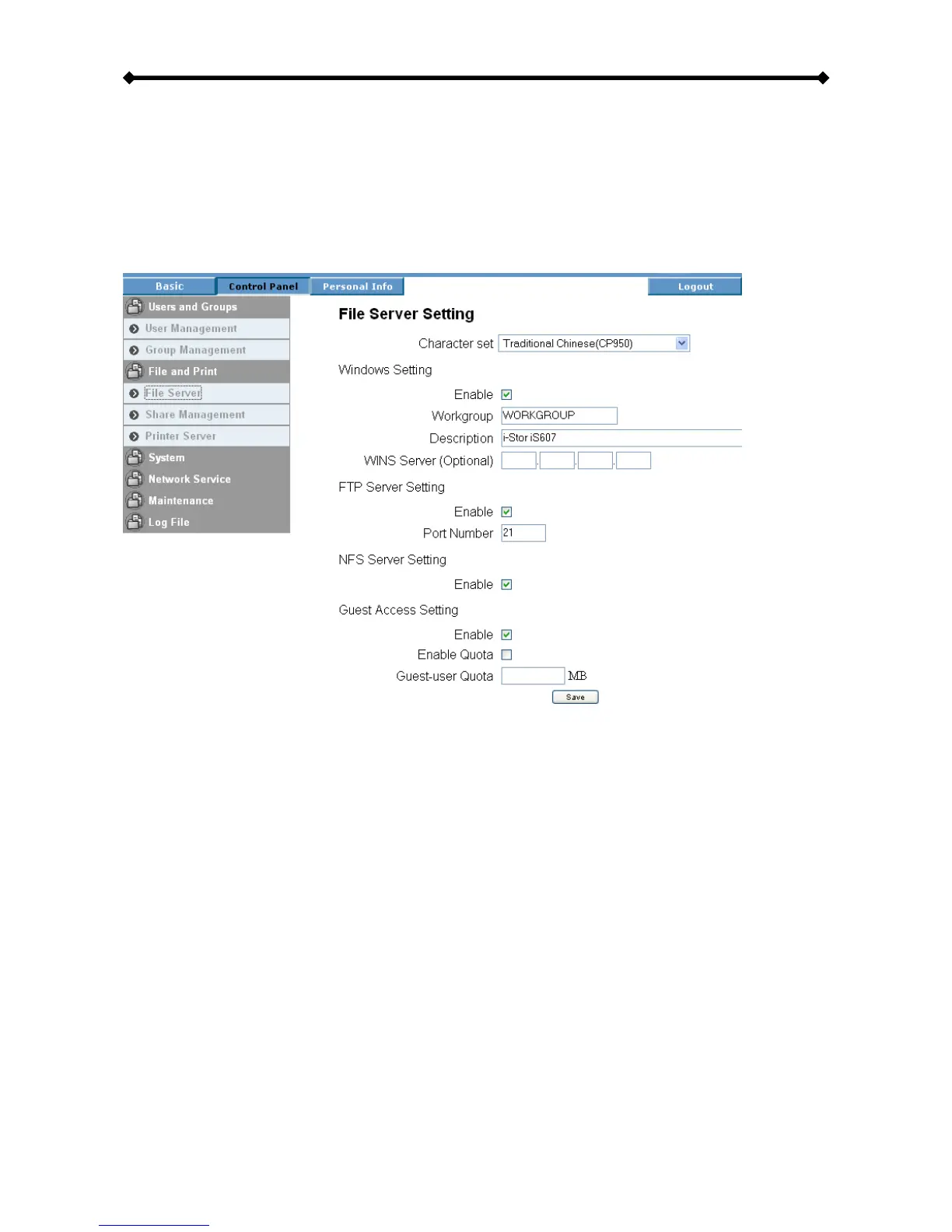 limit for the disk space. For security reasons, the guest access can also be disabled.