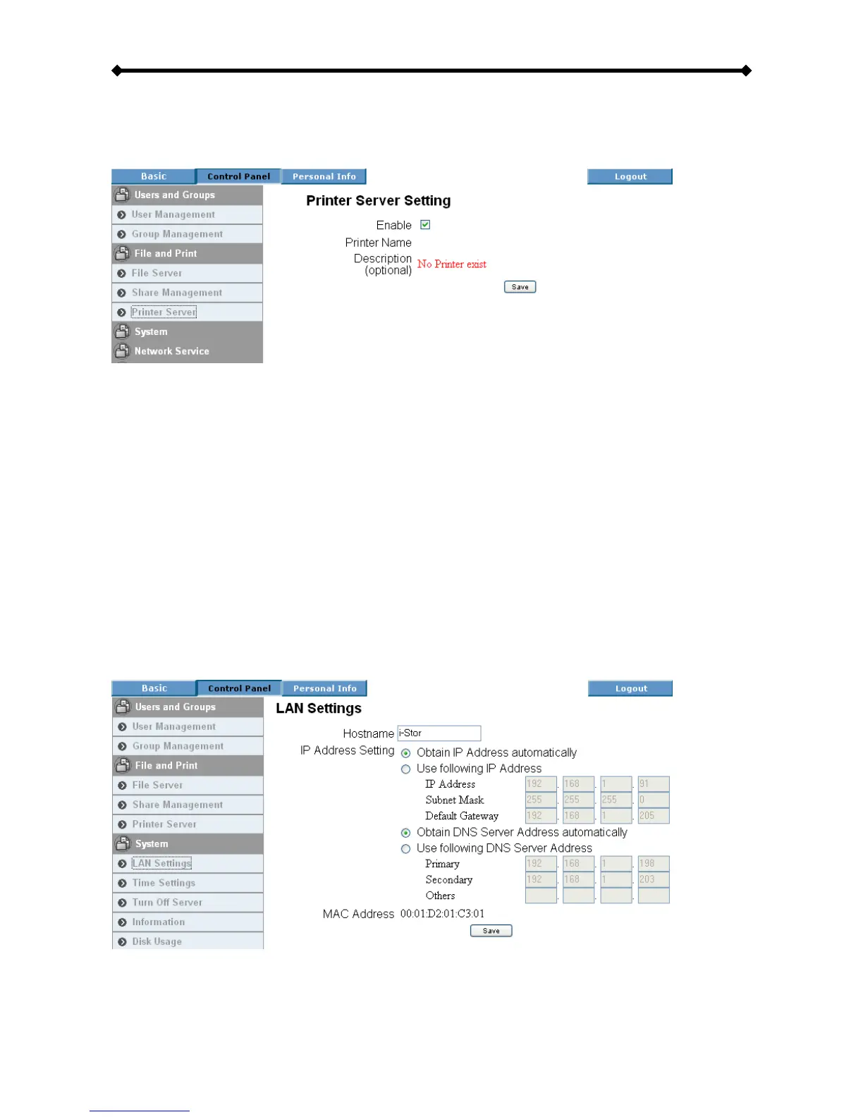 In this menu you can configure the basic network settings for the i-Stor LAN, find some