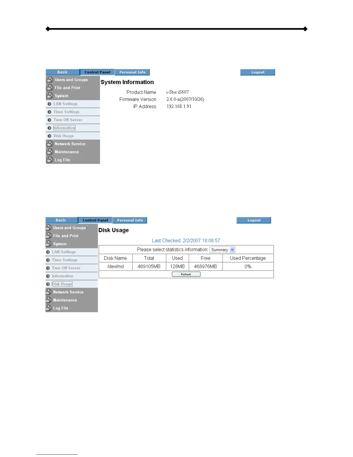 In this section, you can find a summary of the hard disk status and disk usage. Press the