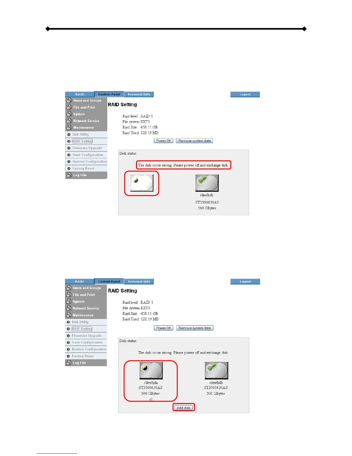 1. Login and go to the RAID Setting menu to check the disk status. If there is a