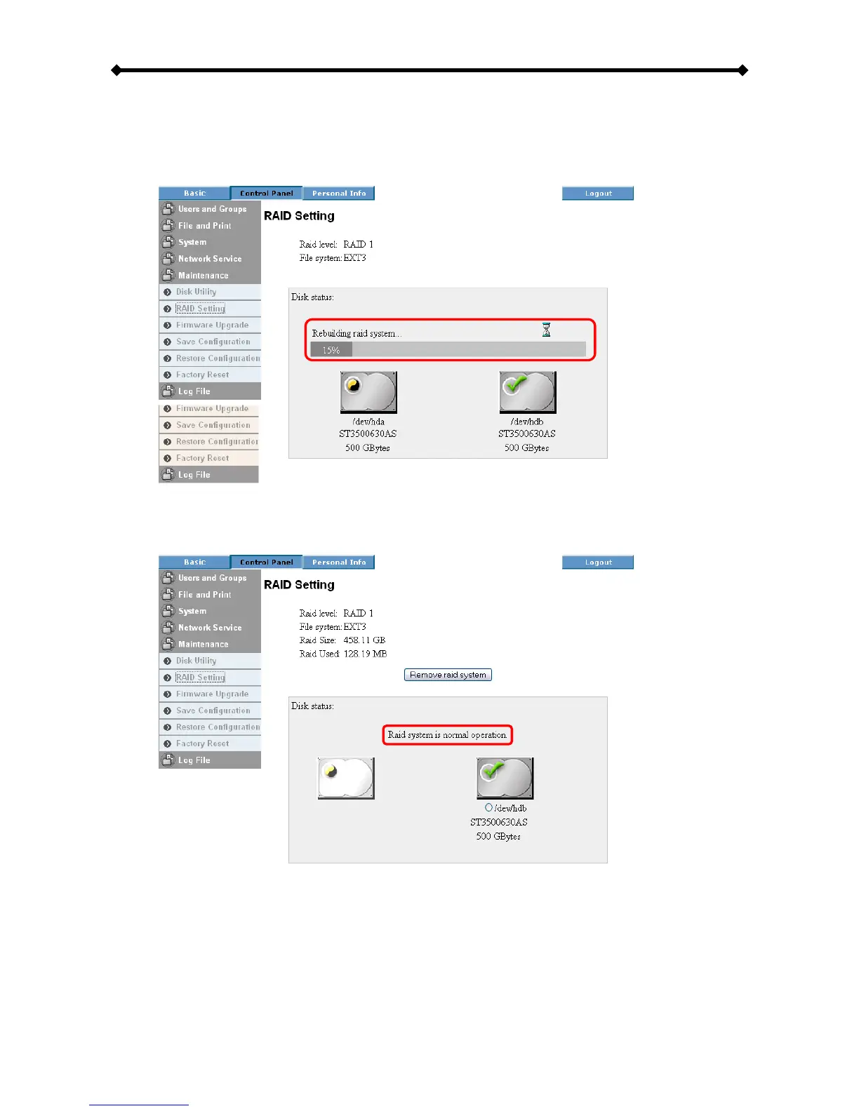Note: Rebuilding the RAID system will take a while, depending on HDD capacity. Do not