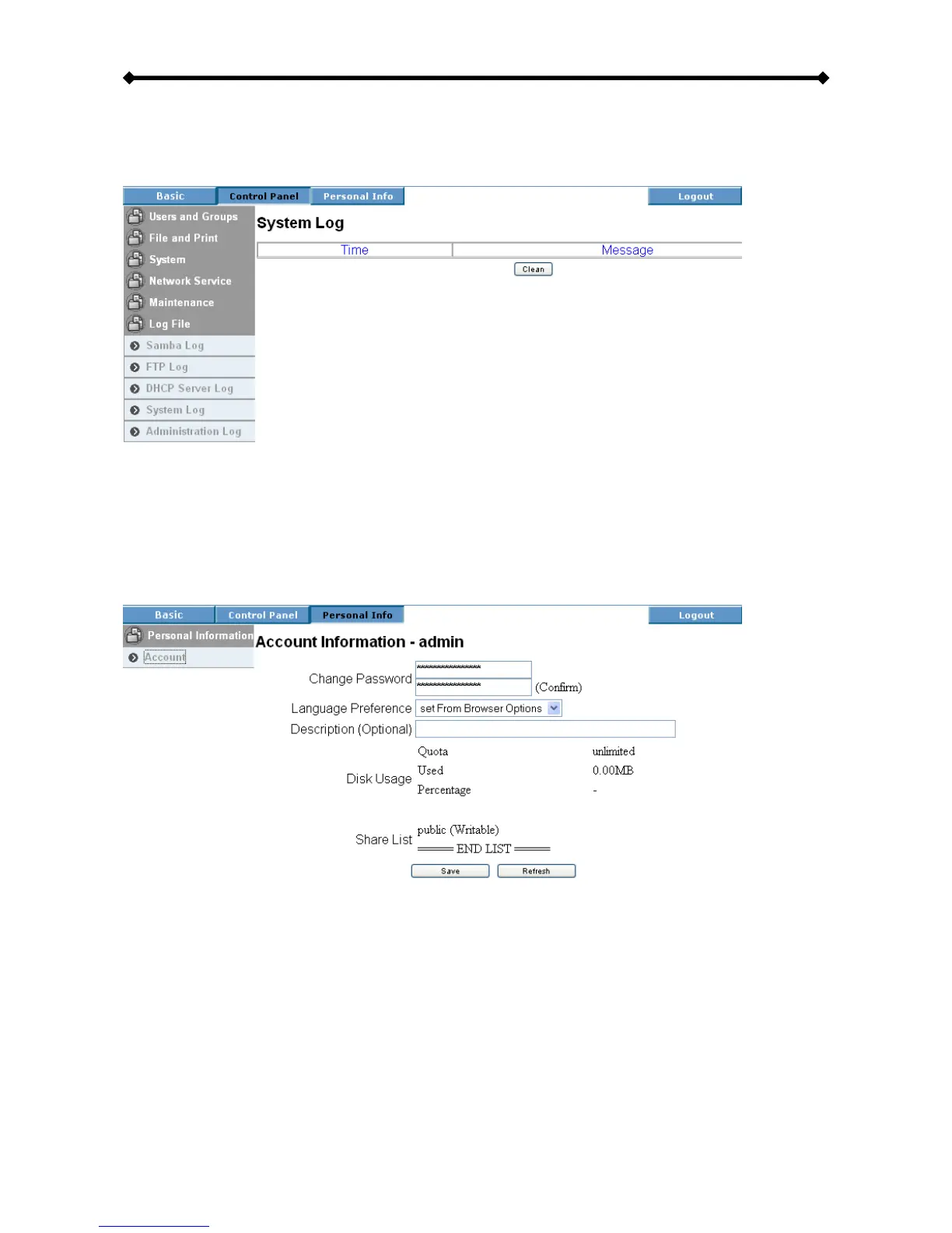 configuration interface. There is also an overview of disk usage and share list available.