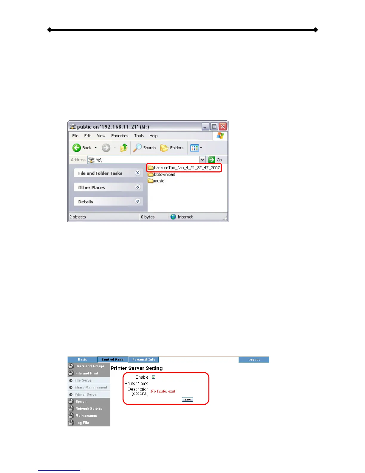 2. Login to make sure the printer server is enabled and the printer is recognised.