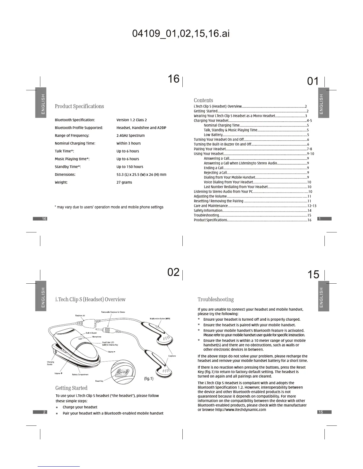i. Tech Dynamic Clip S - I.tech Clip S (Headset) Overview; Getting Started; Product Specifications; Troubleshooting
