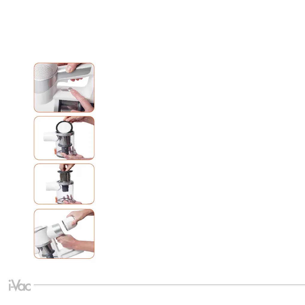 1. Press the dust bin release button and, at the same time, turn the