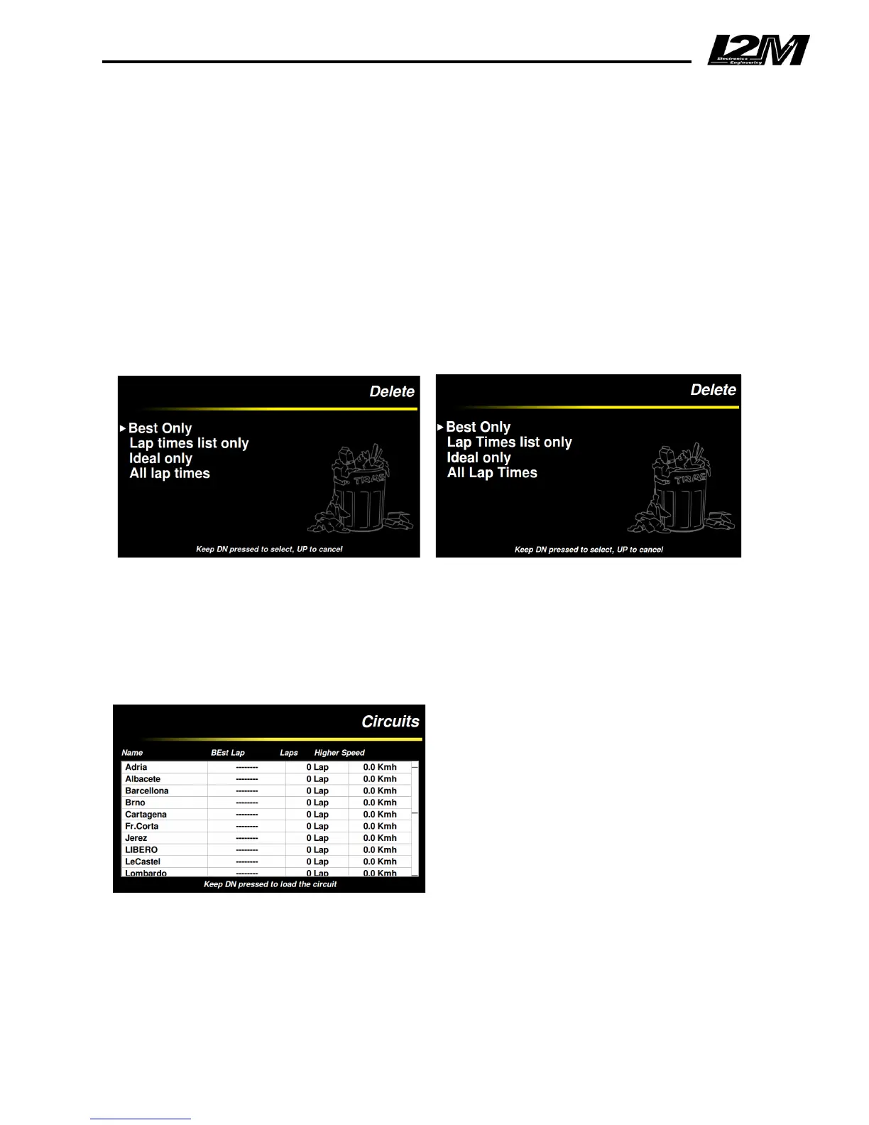 cancellation, it is possible to delete lap times leaving the best and ideal lap stored, or vice versa. In