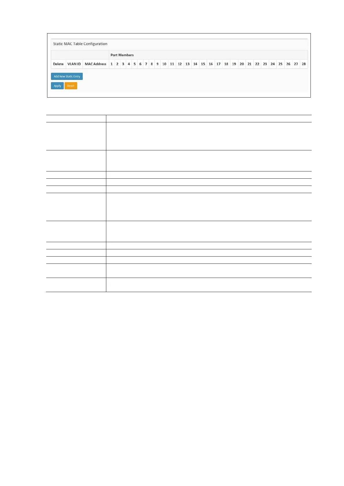 The static entries in the MAC table are shown in this table. The static MAC table can contain