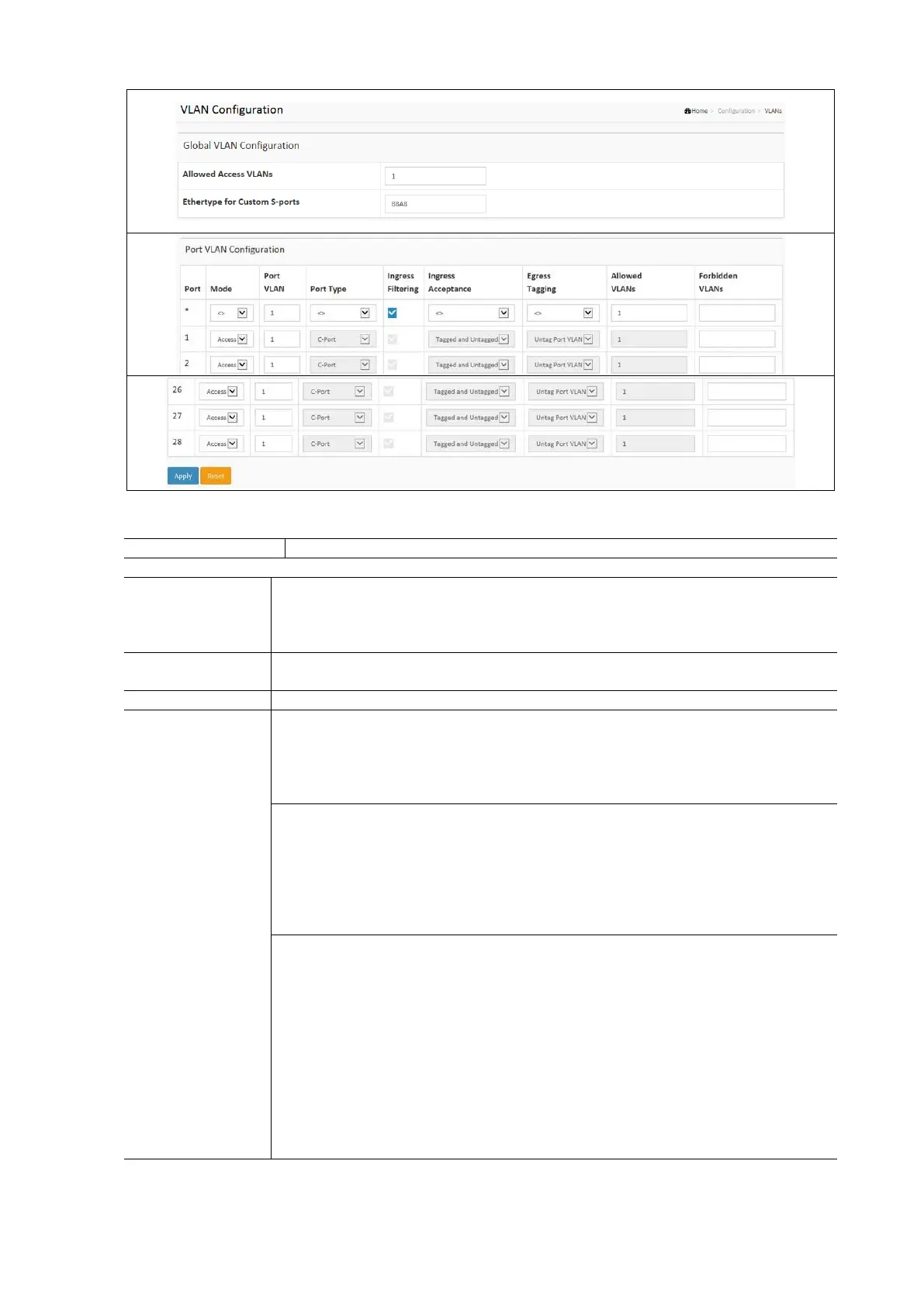 This field shows the VLANs that are created on the switch. By default only VLAN 1 exists. More