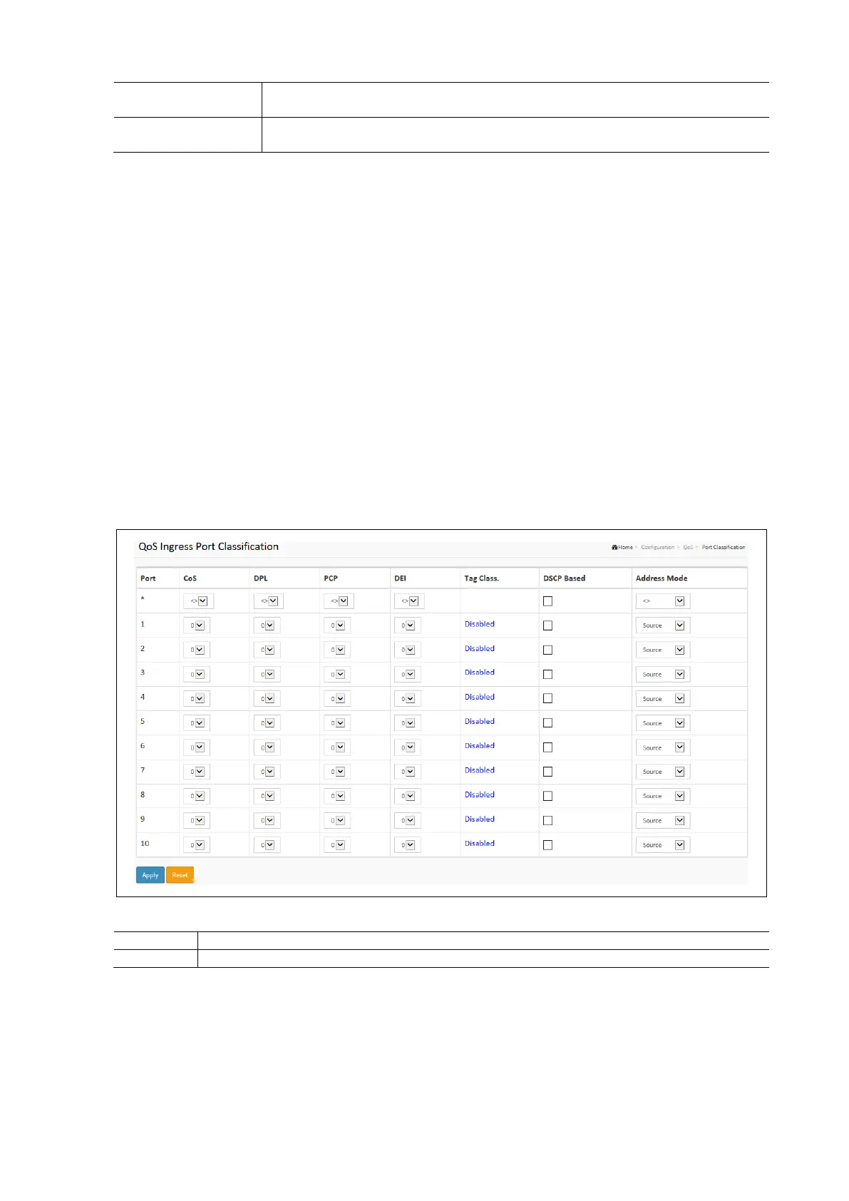 The section allows the configuration of the basic QoS Ingress Classification settings for all switch ports. The settings relate