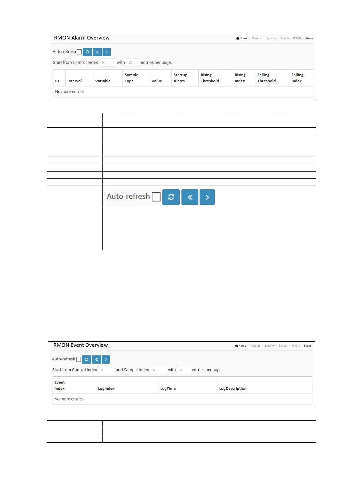 This page provides an overview of RMON Event table entries. Each page shows up to 99 entries from the Event table,