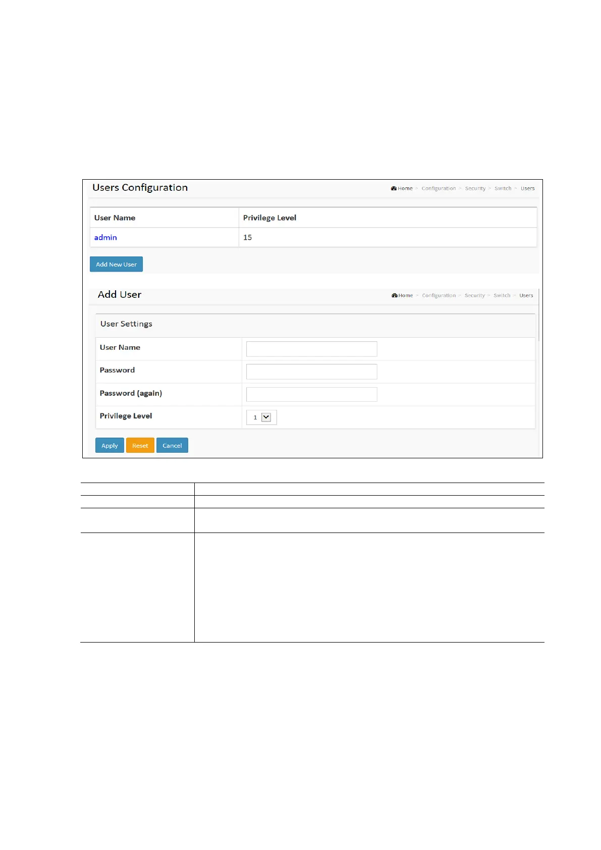 The privilege level of the user. The allowed range is 1 to 15. If the privilege level value is 15,