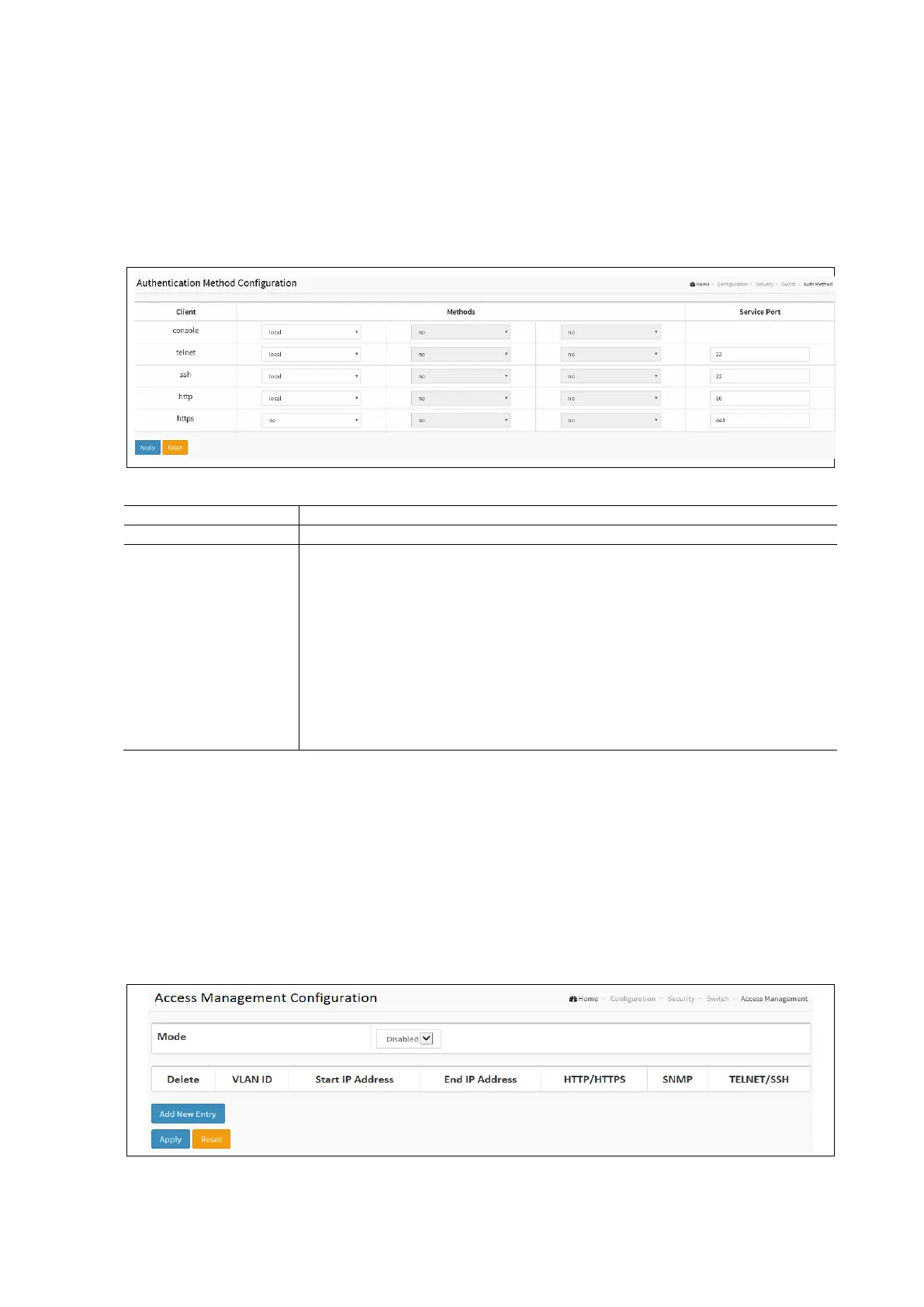 This section explains how to configure the access management table of the switch including HTTP/HTTPS, SNMP, and
