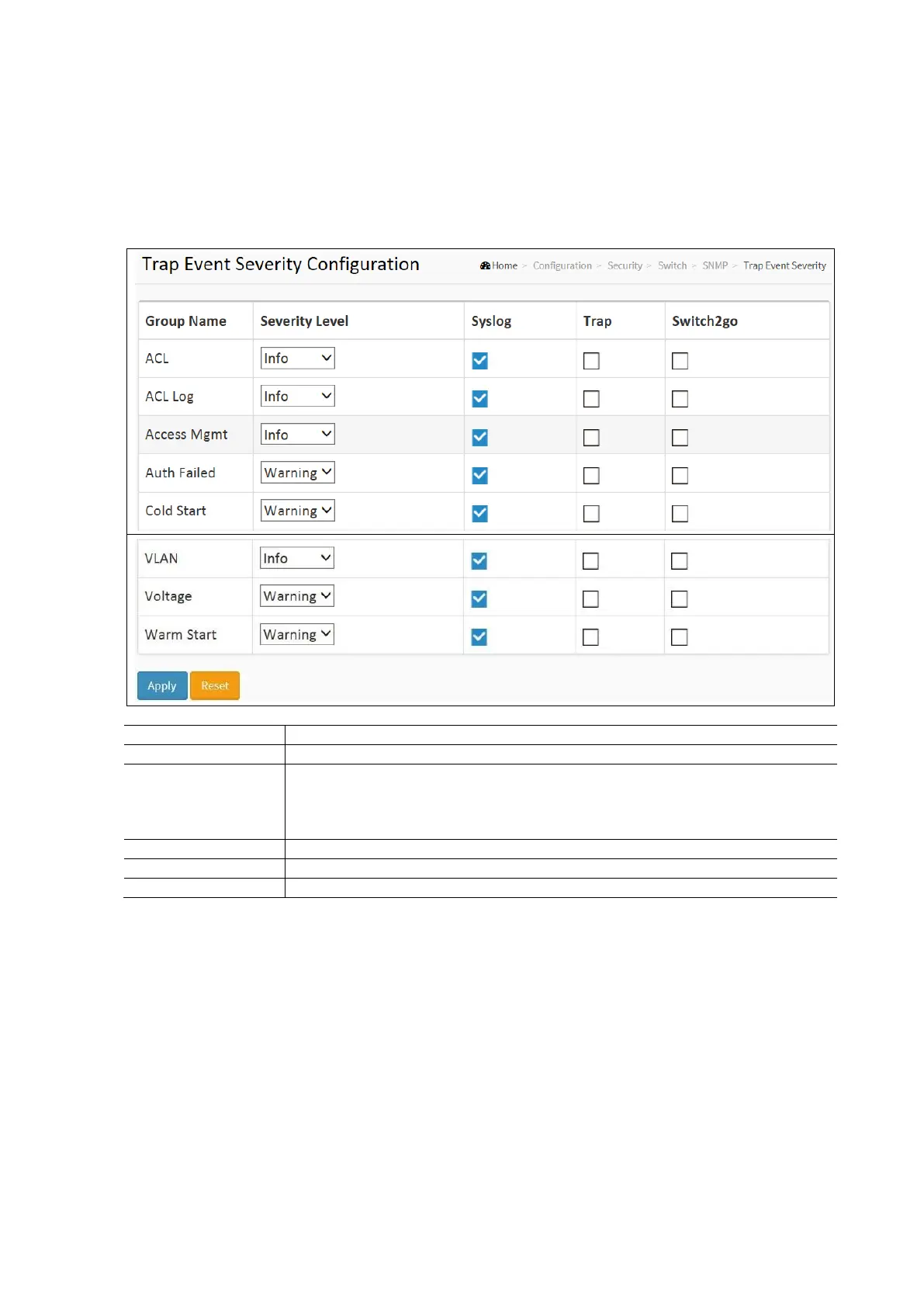 Click Configuration / Security / Switch / SNMP / Trap Event Severity.